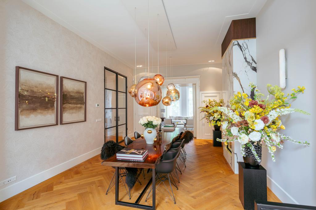 Located on the beautiful Vossiusstraat, this exceptionally stylish and spacious home of 323 m², spread over three floors and situated on freehold land, offers a rare combination of classic elegance and contemporary comfort. Finished with high-quality materials, including herringbone wooden floors, steel pivot doors, marble accents, and multiple gas fireplaces, this property features six bedrooms, three luxurious bathrooms, an expansive live-in kitchen, a beautifully landscaped south-facing garden (157 m²), and stunning views over the park. It provides an exceptional blend of space, tranquility, and urban allure—right in the heart of Amsterdam Oud-Zuid.