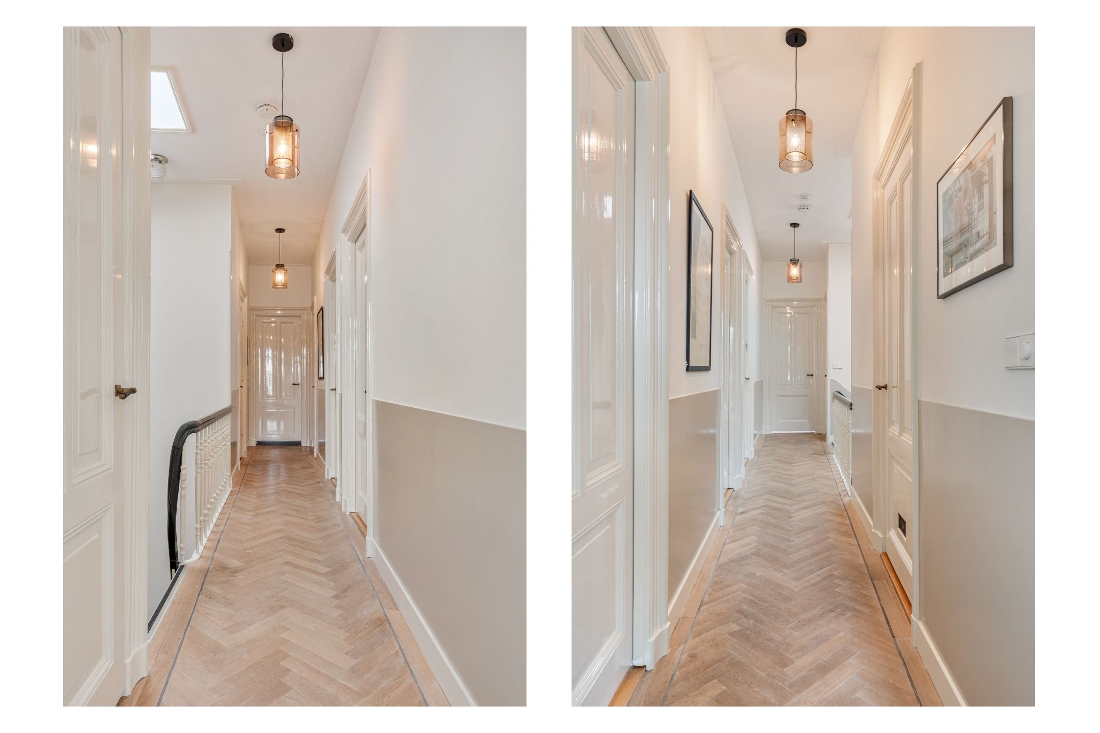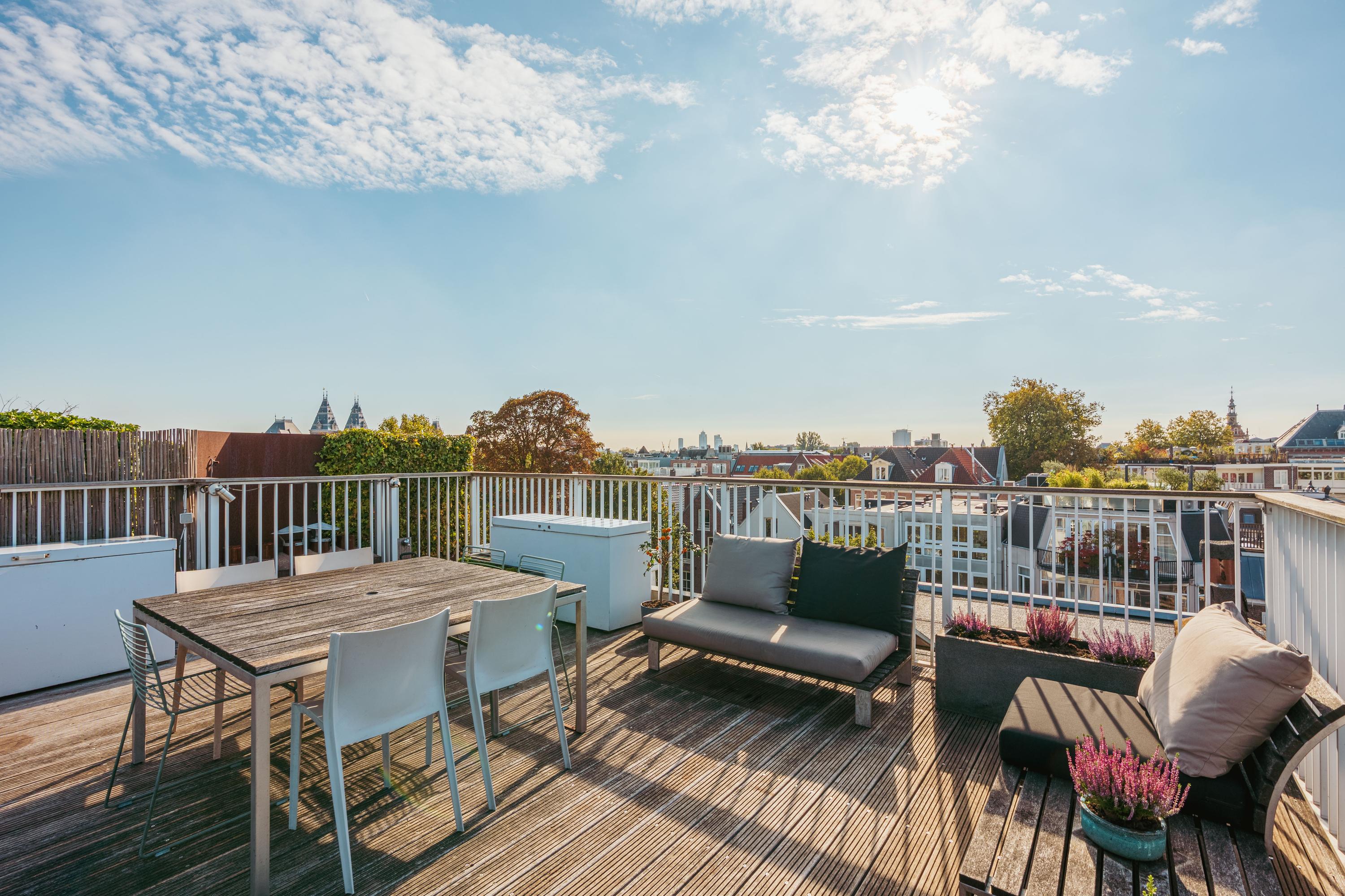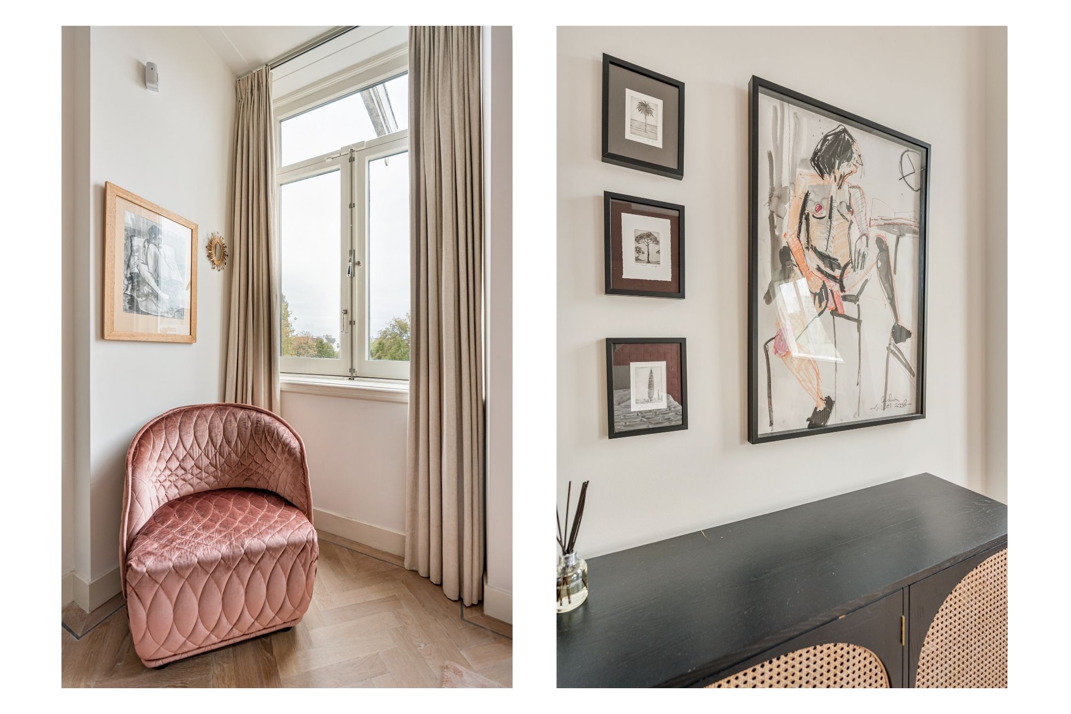 On the distinguished Vossiusstraat, directly bordering the Vondelpark, lies this remarkable upper residence of approximately 183 m², spread over two floors and featuring several outdoor spaces, including a spacious roof terrace of no less than 59 m². The home combines the character of a classic Amsterdam townhouse with the comfort of a modern residence. High ceilings with original ornaments, a light herringbone floor, wooden en-suite doors and marble details give the interior timeless elegance, while the layout and finish create a sense of calm and warmth.