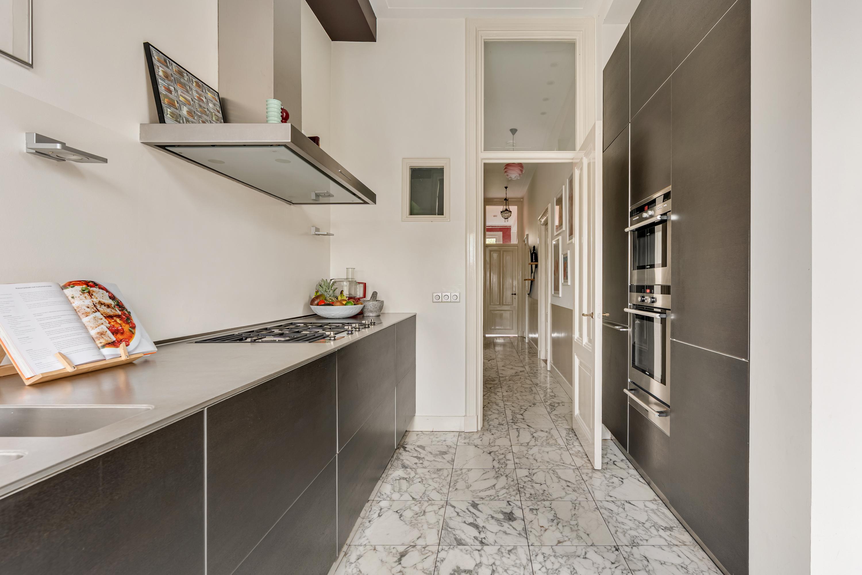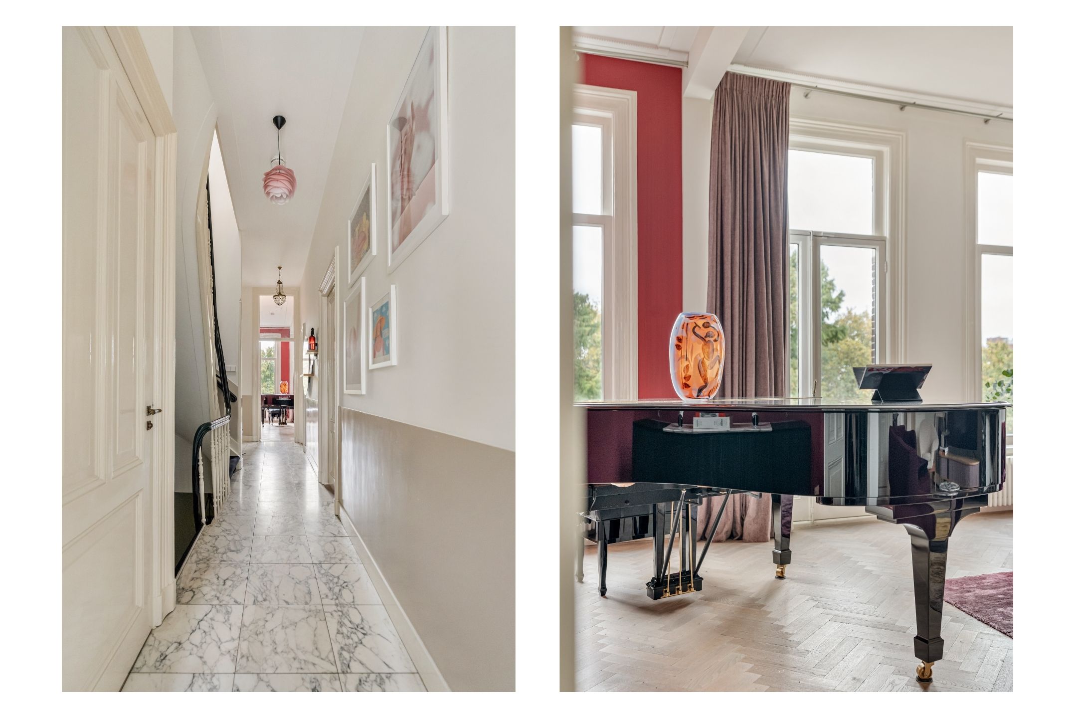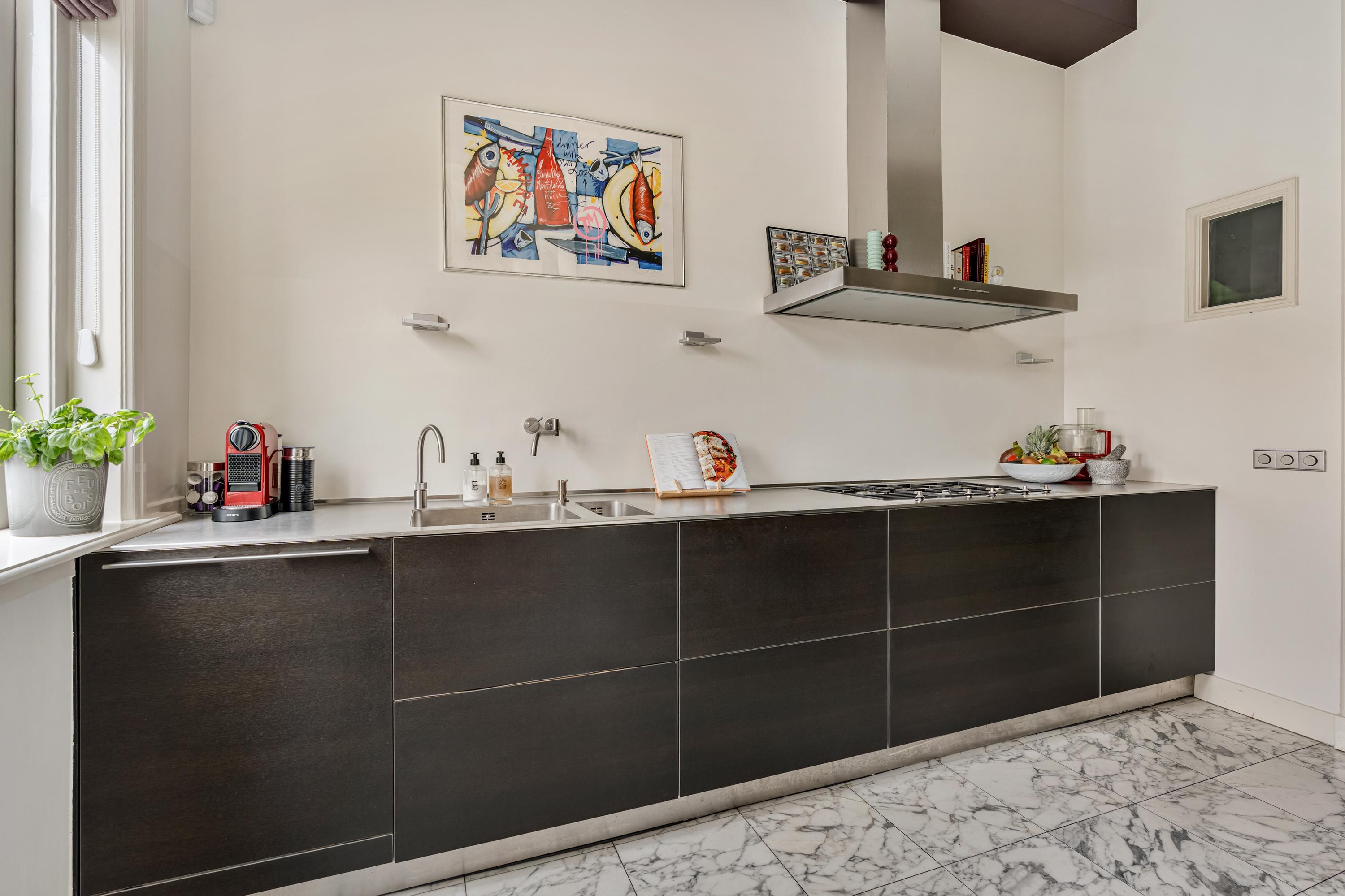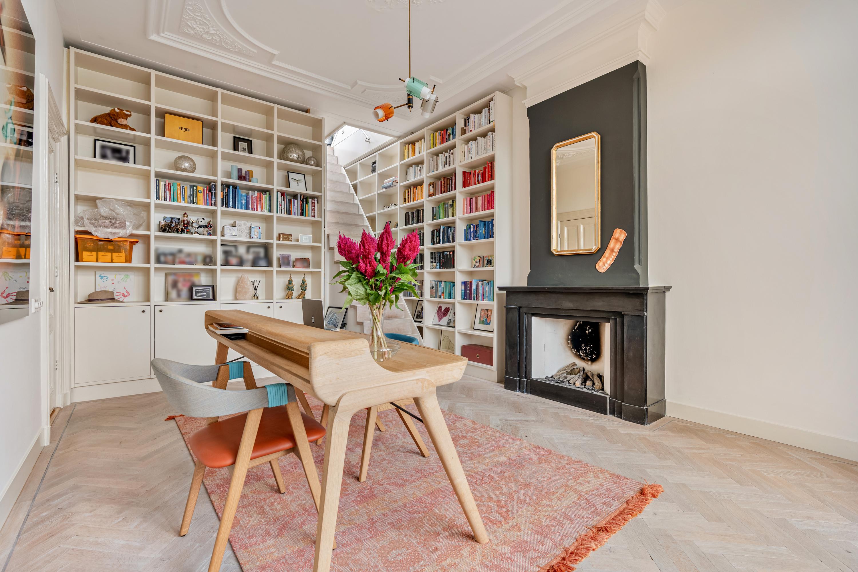 On the distinguished Vossiusstraat, directly bordering the Vondelpark, lies this remarkable upper residence of approximately 183 m², spread over two floors and featuring several outdoor spaces, including a spacious roof terrace of no less than 59 m². The home combines the character of a classic Amsterdam townhouse with the comfort of a modern residence. High ceilings with original ornaments, a light herringbone floor, wooden en-suite doors and marble details give the interior timeless elegance, while the layout and finish create a sense of calm and warmth.