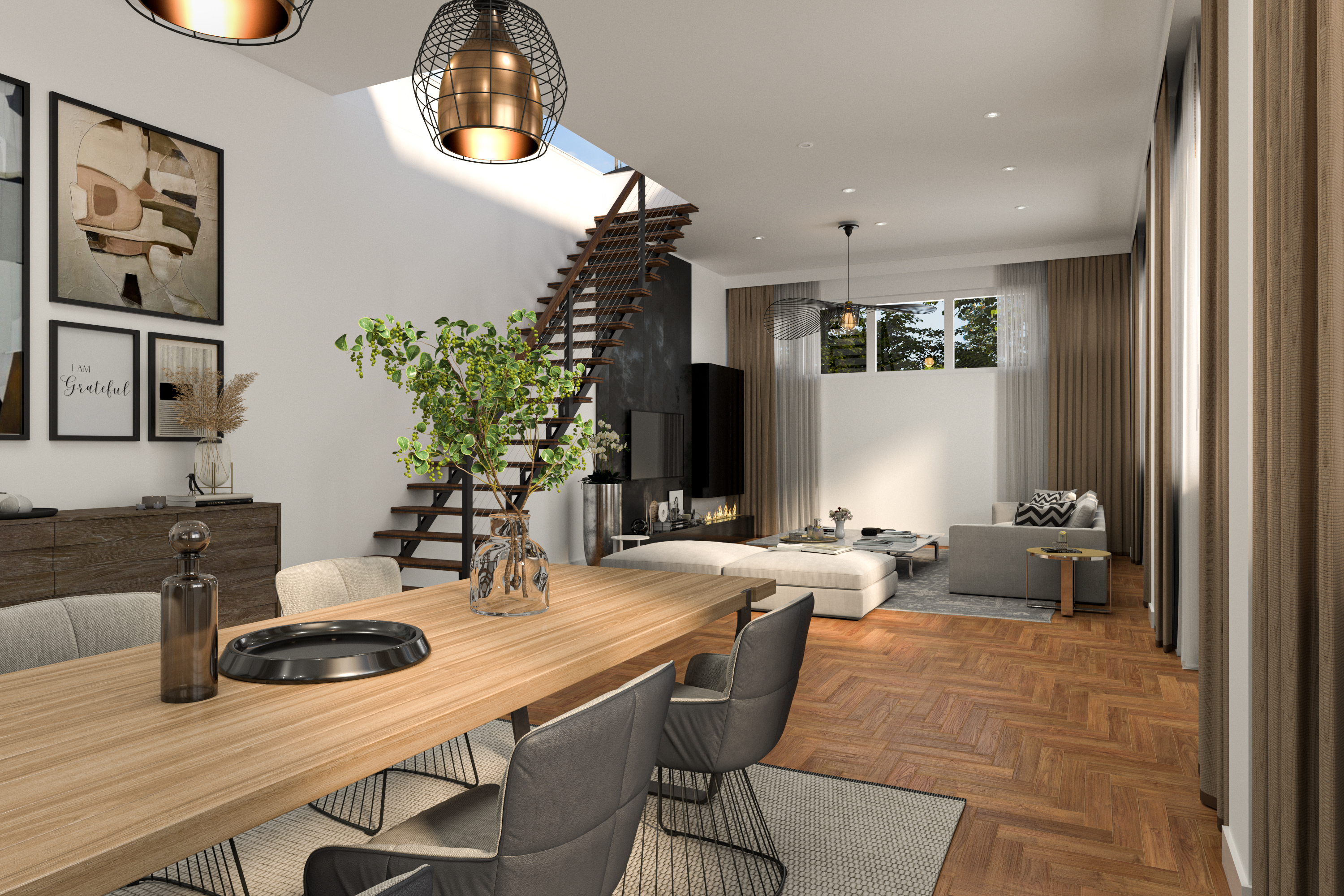 The living room is characterised by its many windows, which provide beautiful natural light and a spacious atmosphere. There is ample room for a large dining table where you can enjoy long dinners with friends and family, as well as a generous seating area with, for example, a custom-made wall cabinet. We can already picture it — can you? If desired, an interior stylist is available to assist you in realising your living wishes.