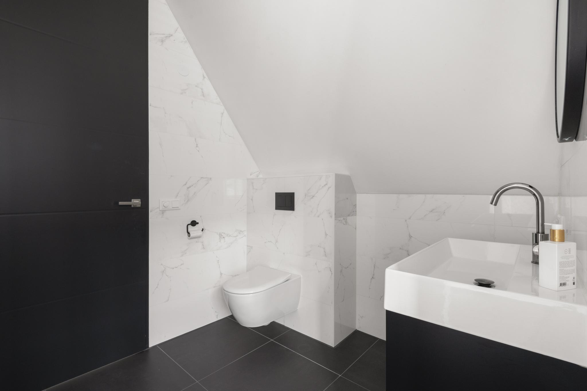 The second floor offers an additional large bedroom and a second bathroom with a vanity unit, bathtub and walk-in shower, providing extra comfort and privacy. There is also plenty of storage space in the attic and the floor includes a separate utility room with advanced installations such as a geothermal heat pump and a heat recovery unit for optimal indoor climate.