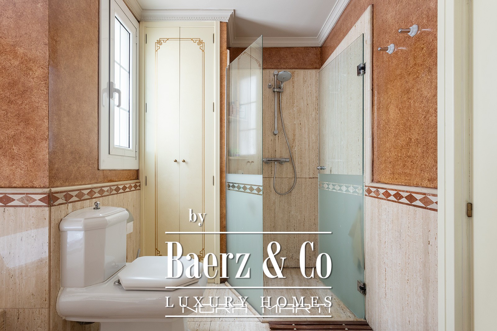 It has underfloor heating and air conditioning in all rooms, ensuring year-round comfort. The suite overlooks a quiet interior courtyard, perfect for relaxing without noise.