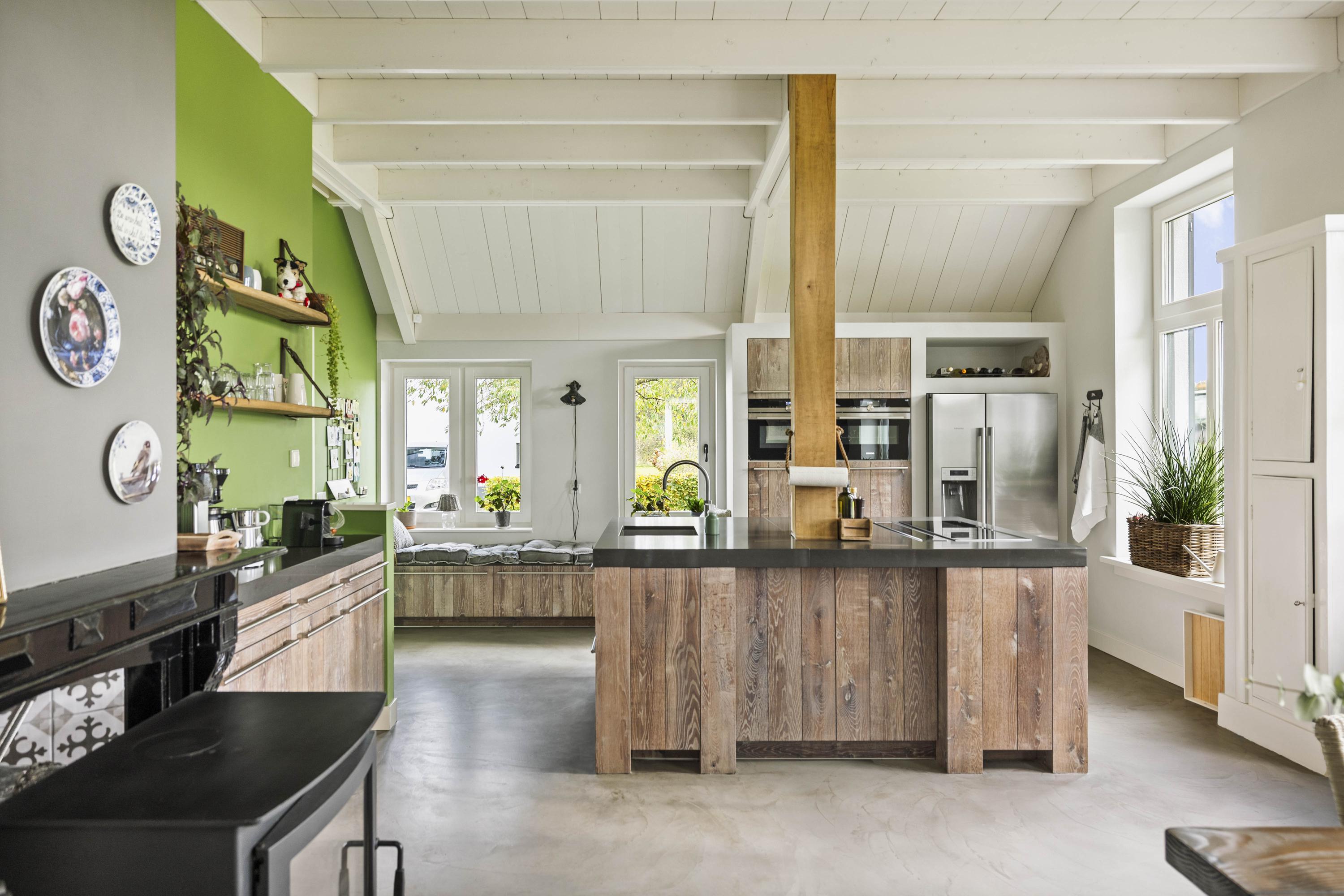 The kitchen is custom-made by Scheffer Keukens Zelhem and is nothing short of impressive; with a thick composite worktop, robust solid oak fronts and all modern built-in appliances – from induction hob to Quooker – it is a wonderful place to indulge your inner chef. The old fireplace still has a sturdy Nordic Fire wood-burning stove, which provides the kitchen with extra atmosphere and warmth.