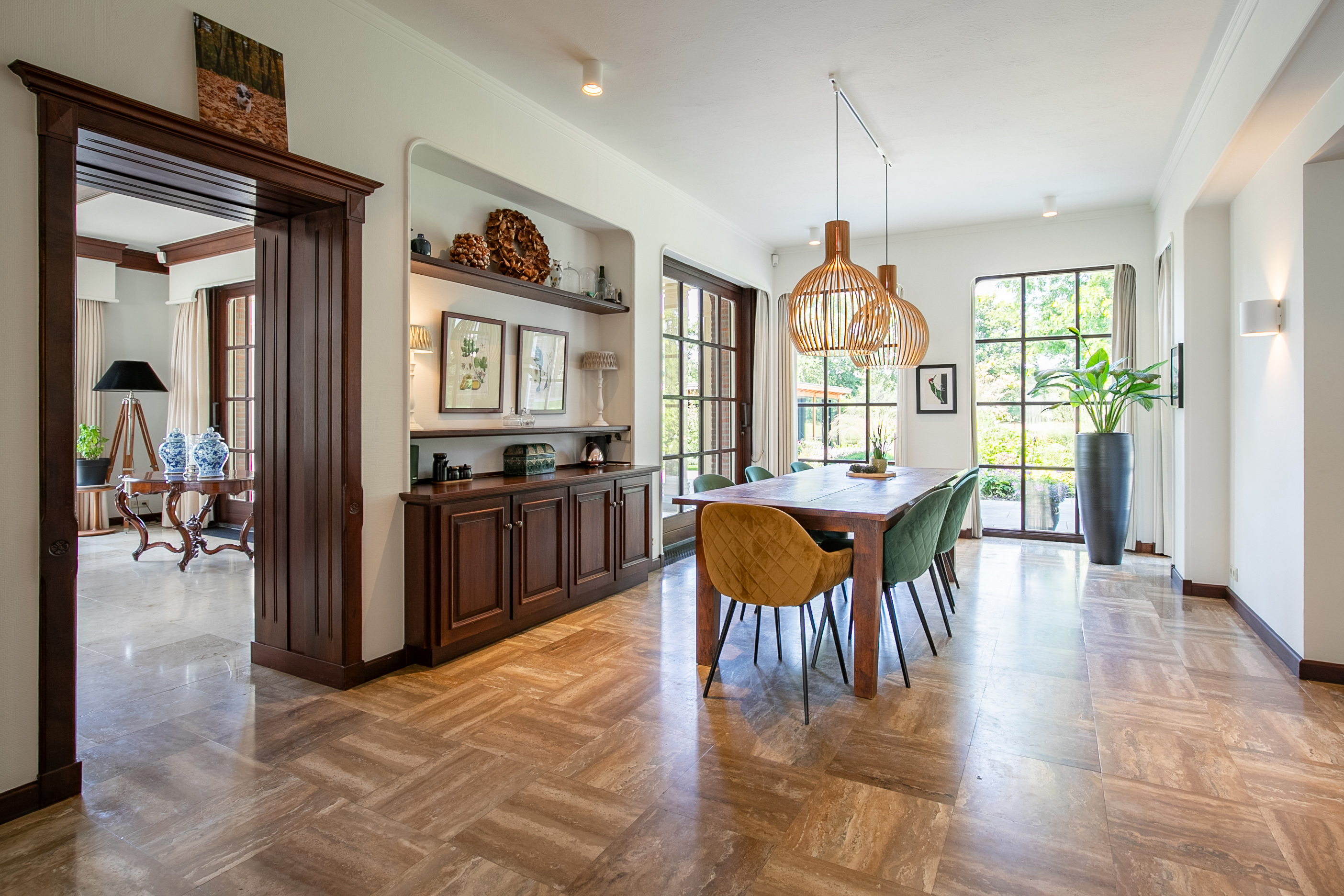 Thanks to the large glass facades and numerous windows, there is seamless contact with the beautiful landscaped garden, and an abundance of natural light.This comfortable home features a spacious living room, a luxurious kitchen with cooking island, a generous ground-floor (bed)room or office, five (bed)rooms on the first floor, and no less than three bathrooms.