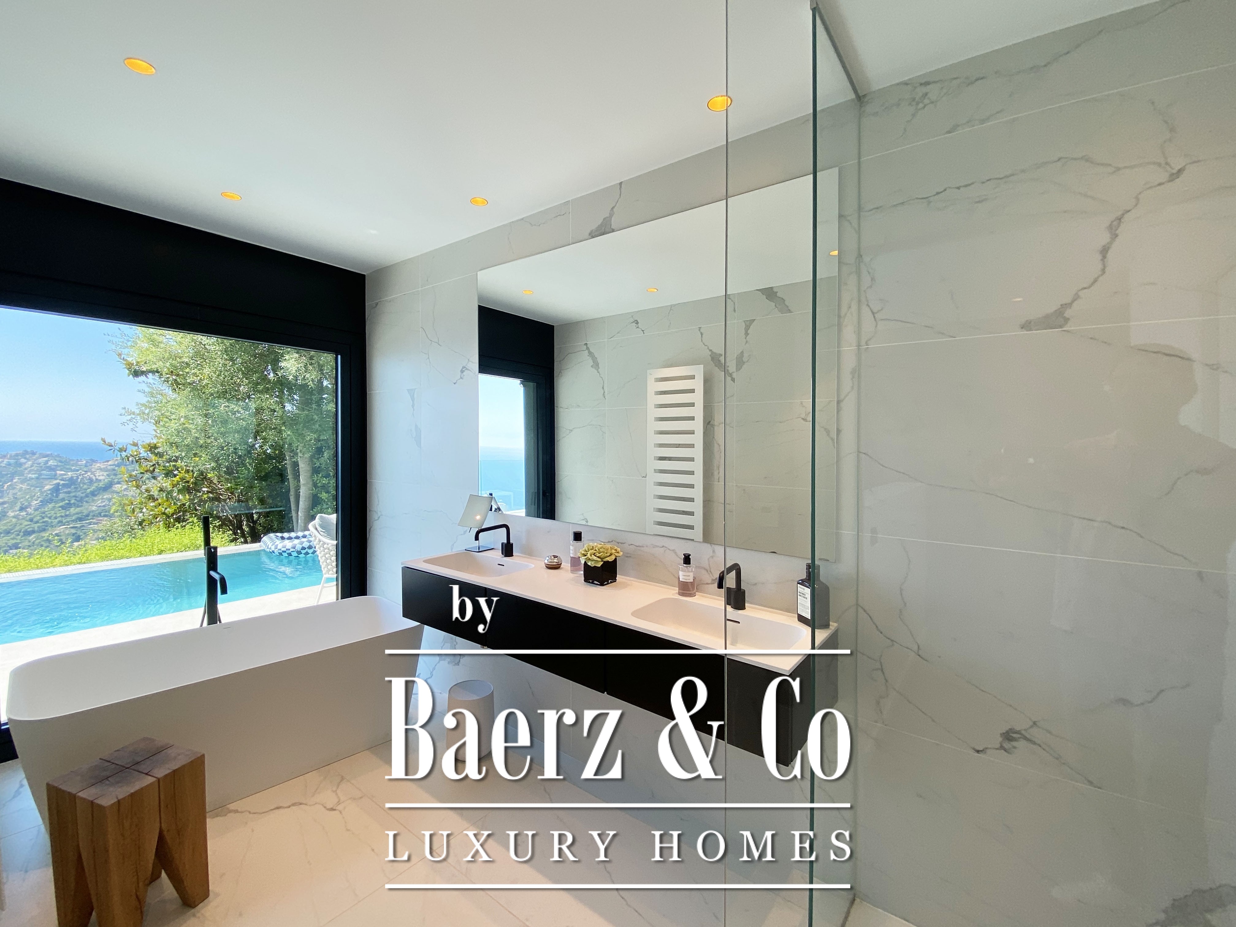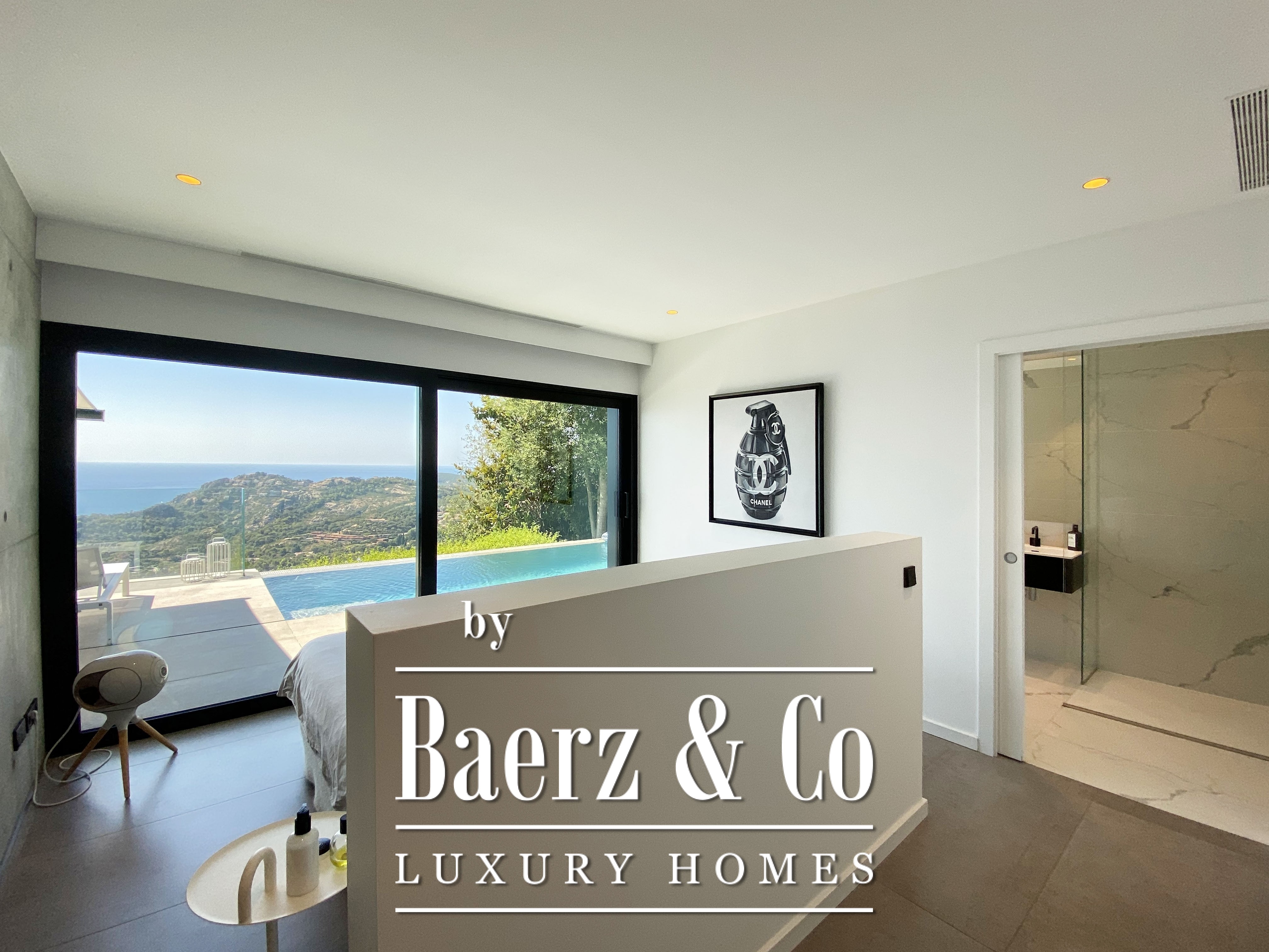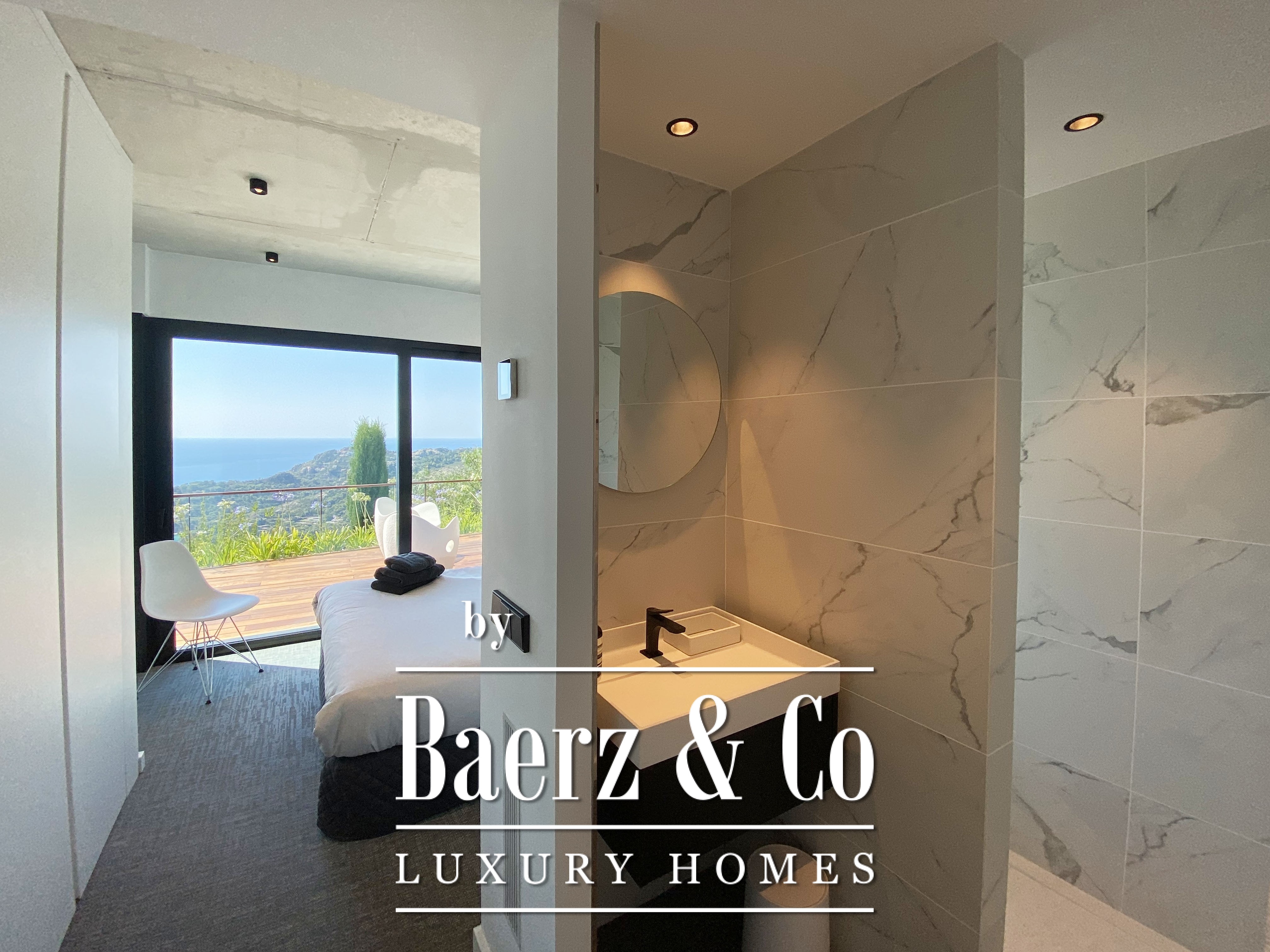 Designed across three interconnected levels and offering 431 m² of living area on a 977 m² plot, the villa invites natural light through expansive windows, framing sea and mountain views in every principal space. The superior level features ample parking, a reclining lounge area and an elegant double bedroom with en-suite, ideal for guests or a master suite. On the main level, a luminous living room opens to a terrace with an infinity pool, where panoramic views of the Mediterranean unfold. The American kitchen, equipped with premium appliances, adjoins functional spaces such as a laundry room and a sunny main suite with private bathroom and dressing room.