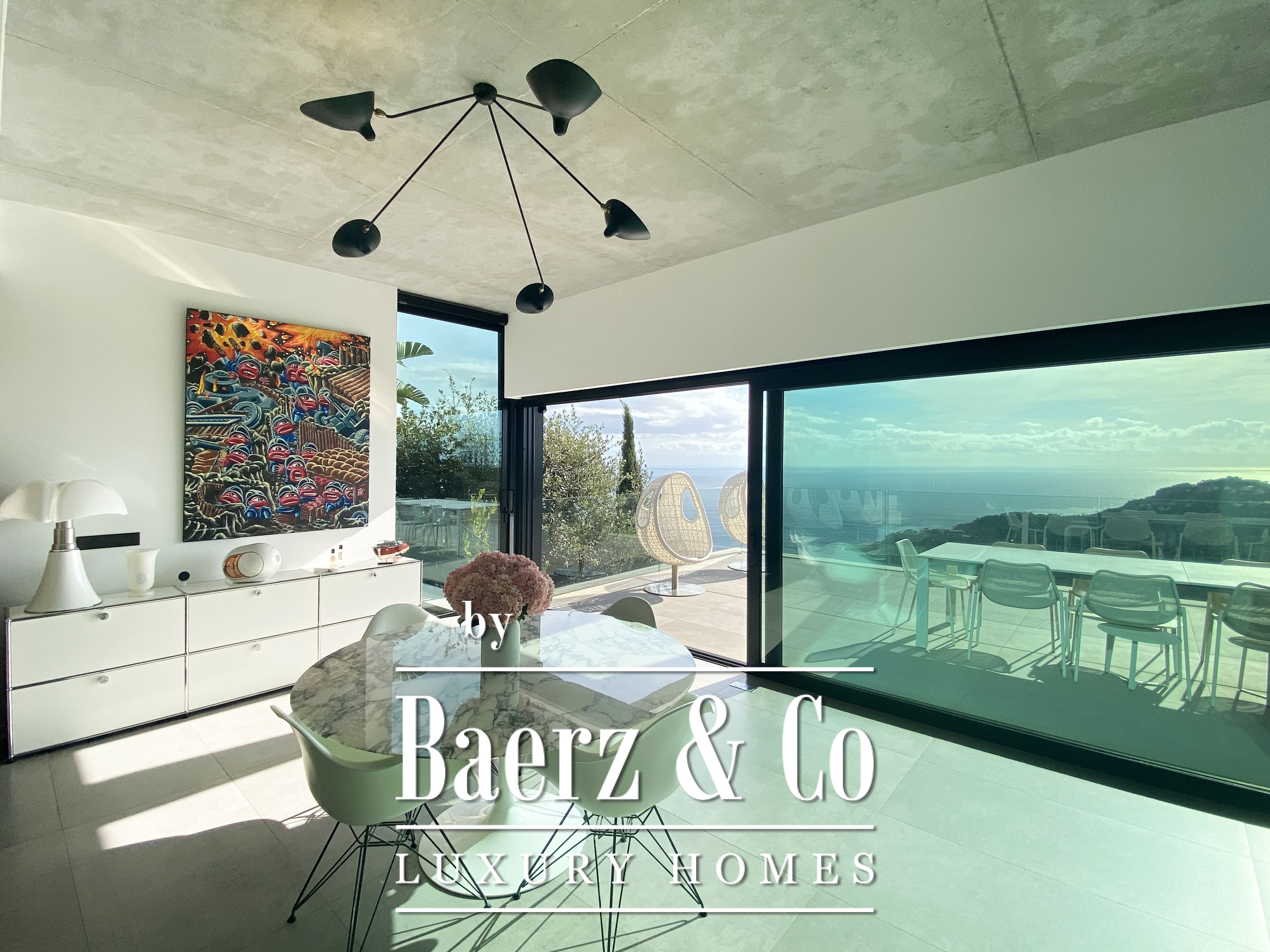 The ground floor hosts four spacious double bedrooms, each with a private bathroom and direct access to terraces overlooking the sea—designed for privacy and tranquility. Energy efficiency is prioritized throughout, underscored by an energy class B rating. Signature furnishings from Knoll, Vitra and B&B Italia, as well as iconic lighting by Flos and Serge Mouille, express a commitment to quality and design.