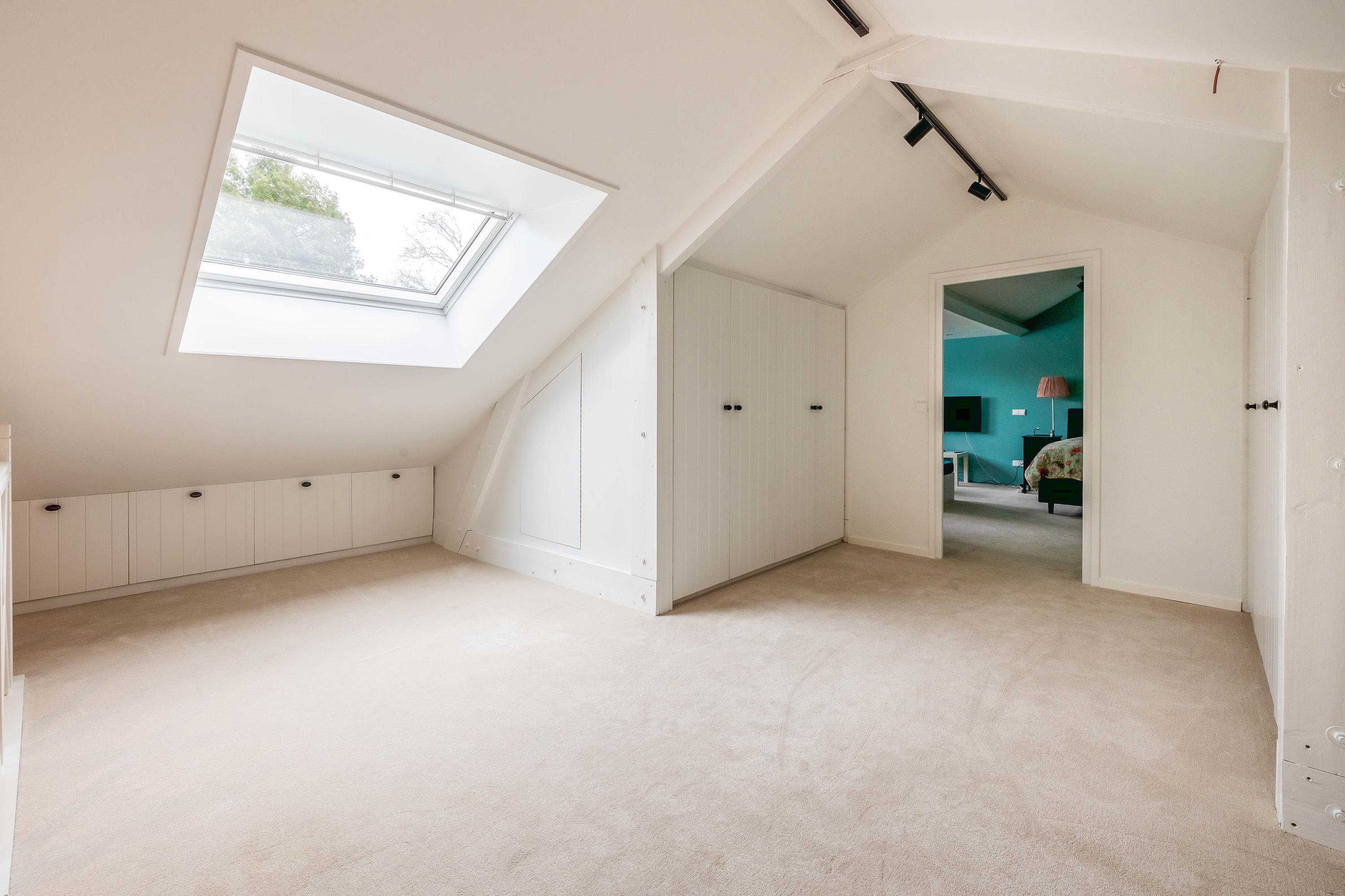 The very spacious bedroom (approx. 28 m²) is fitted with a large dormer with integrated electric shutters, blinds, and insect screens. The room includes many fixed elements such as benches and a desk. Both the landing and the bedroom are carpeted.