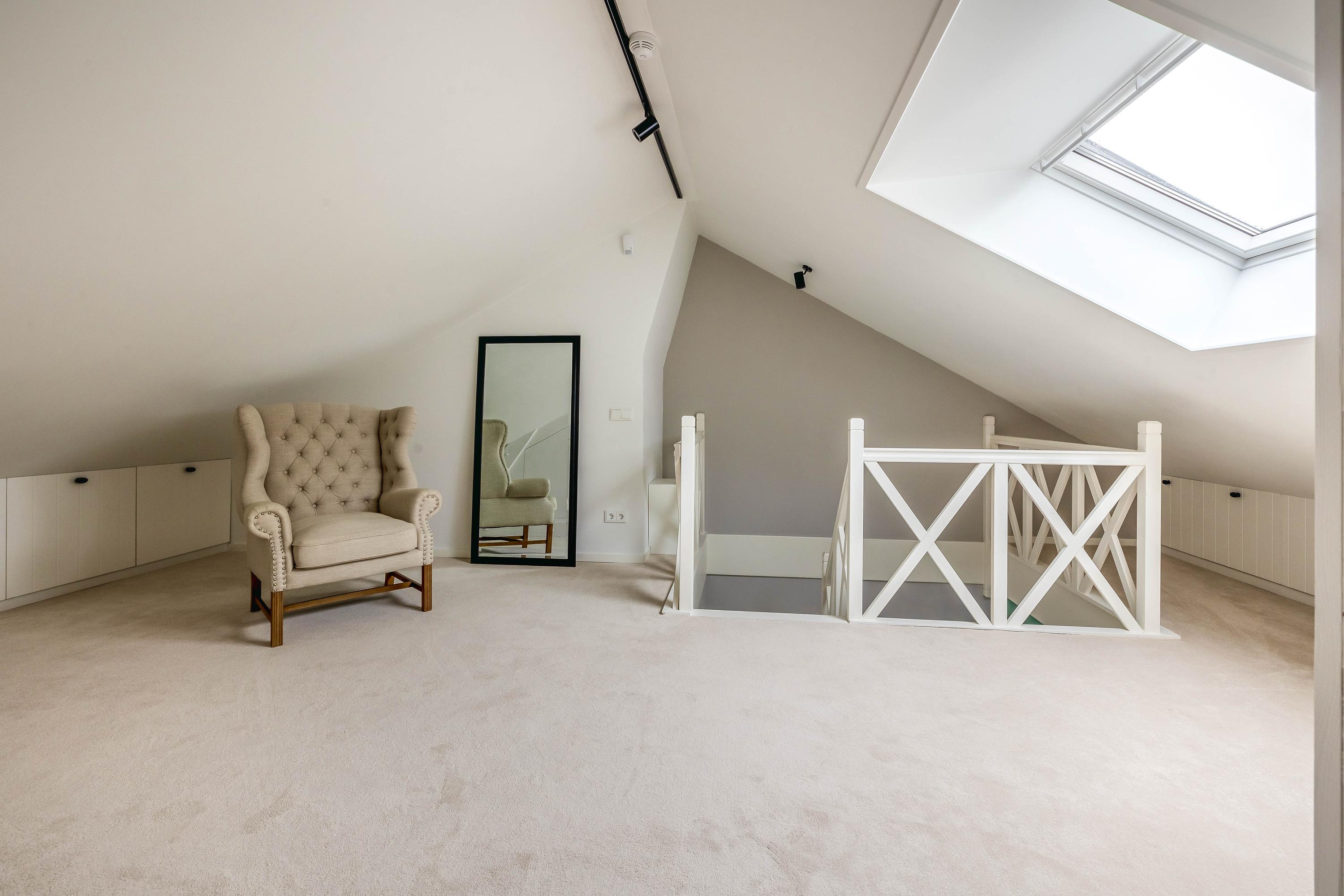 The new fixed staircase provides access to the first floor. This unique and very spacious floor features a generous landing with a Velux roof window with screen, various storage spaces, and a water connection, allowing for the creation of a bathroom as well as a second bedroom.