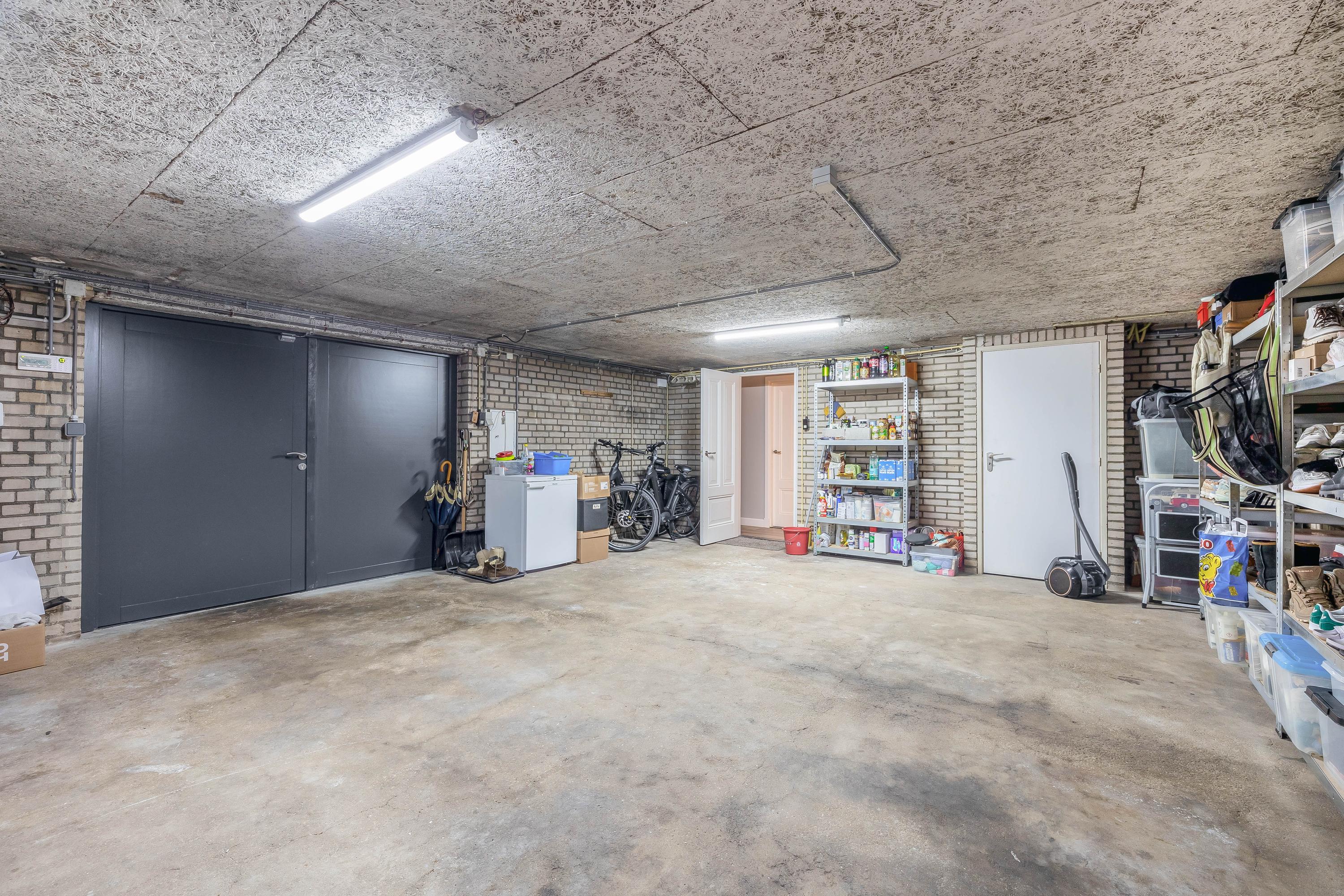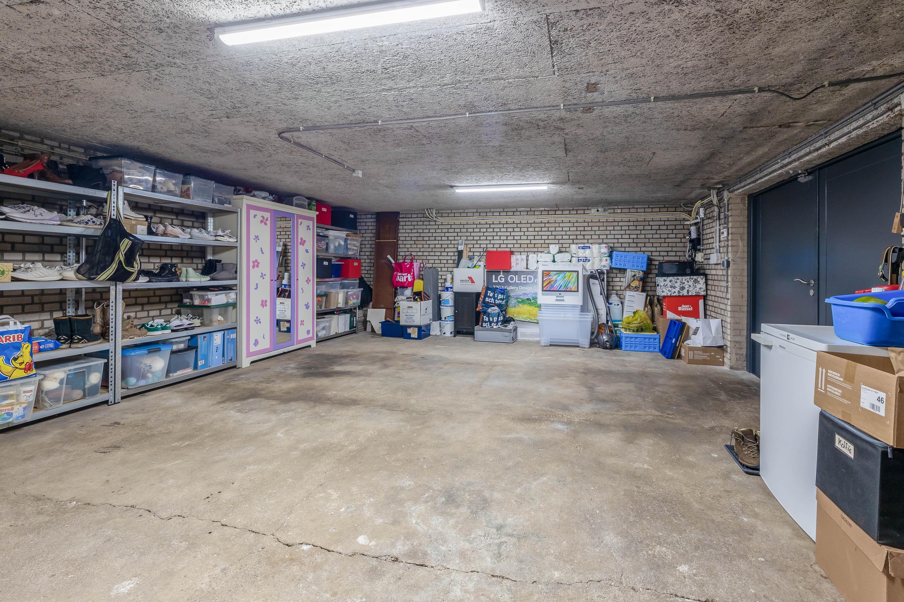 The spacious basement includes a large garage (approx. 40 m²), a storage room (approx. 9 m²) with a renewed meter cupboard, and a technical room with the central heating boiler. A pedestrian door and double doors provide access to the outside.