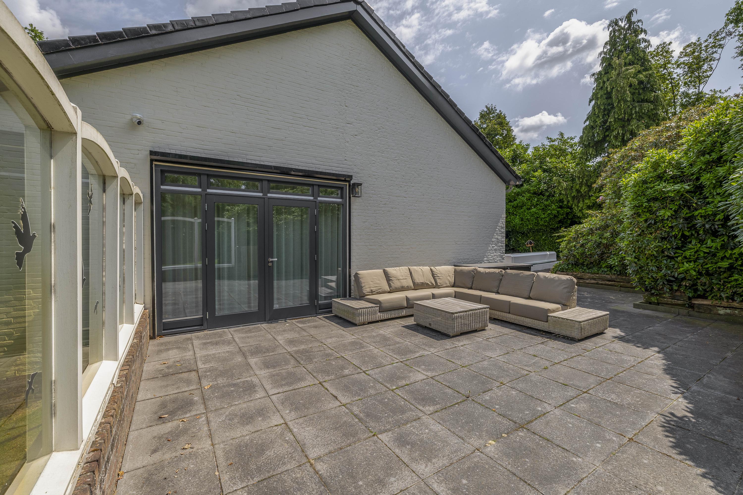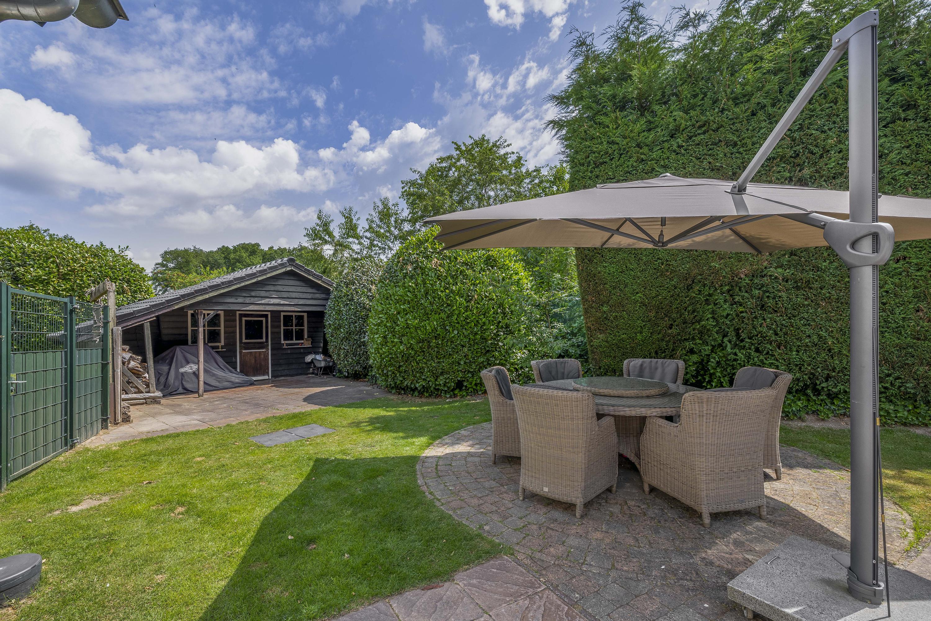 The garden surrounds the entire property. On the left side, a terrace offers a beautiful view of the River Maas. The garden is lush and green. The swimming pool measures approximately 10 x 5 meters. The private driveway provides parking space for multiple cars.
