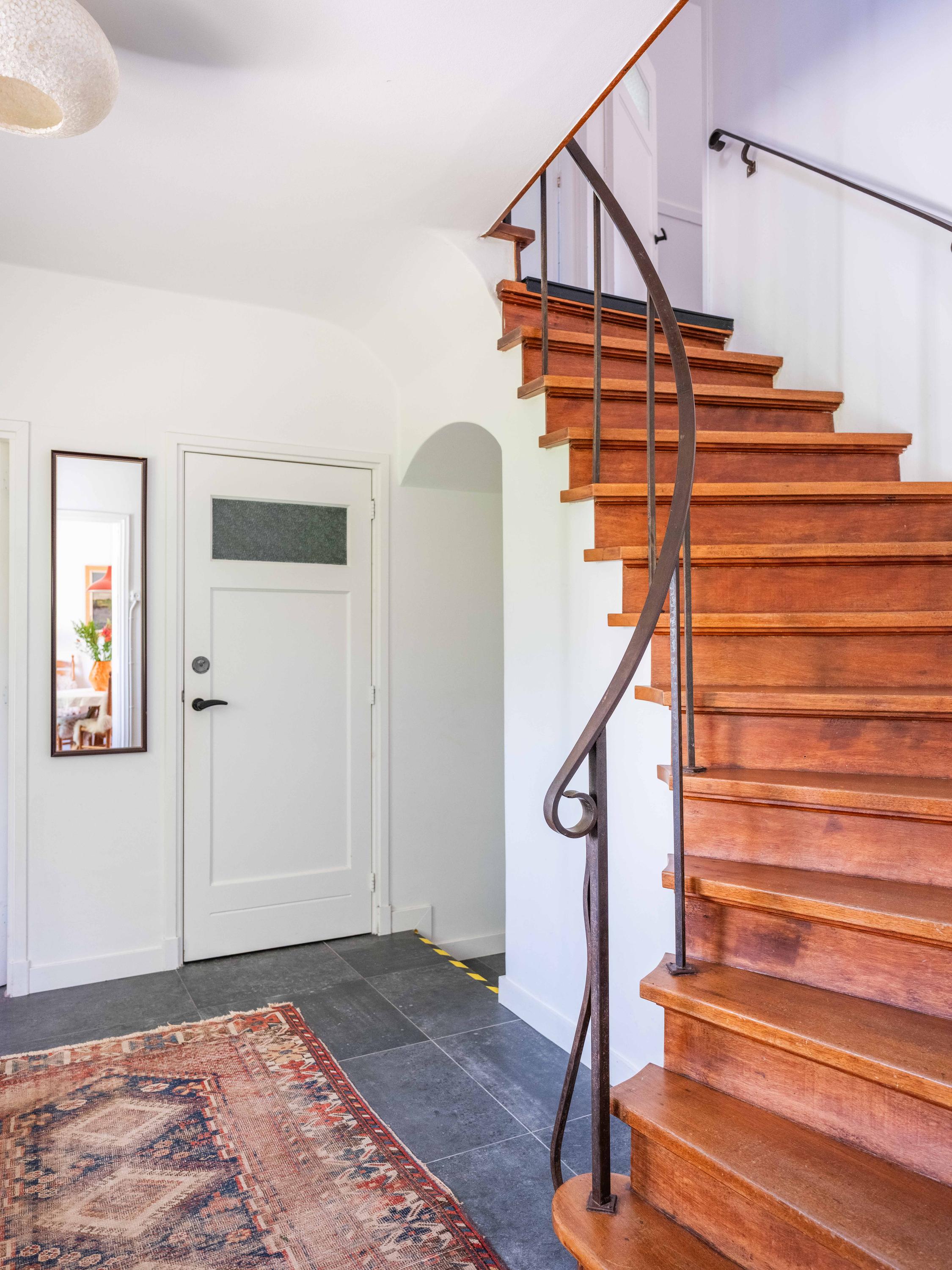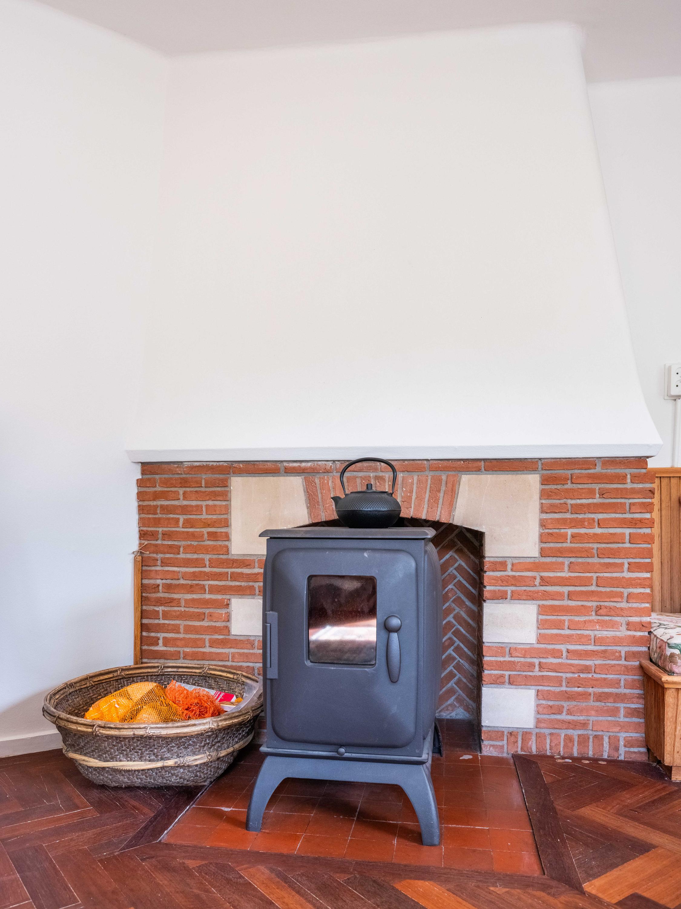 Let us take you inside. Upon entering, you will immediately notice the beautiful entrance hall with a stylish staircase with wrought iron railing, a modern toilet, and a handy basement closet. The living room is bright and cozy with original wooden parquet flooring, a wood-burning stove, and French doors opening onto the green garden. Built-in custom wooden cabinets add extra charm and storage space.