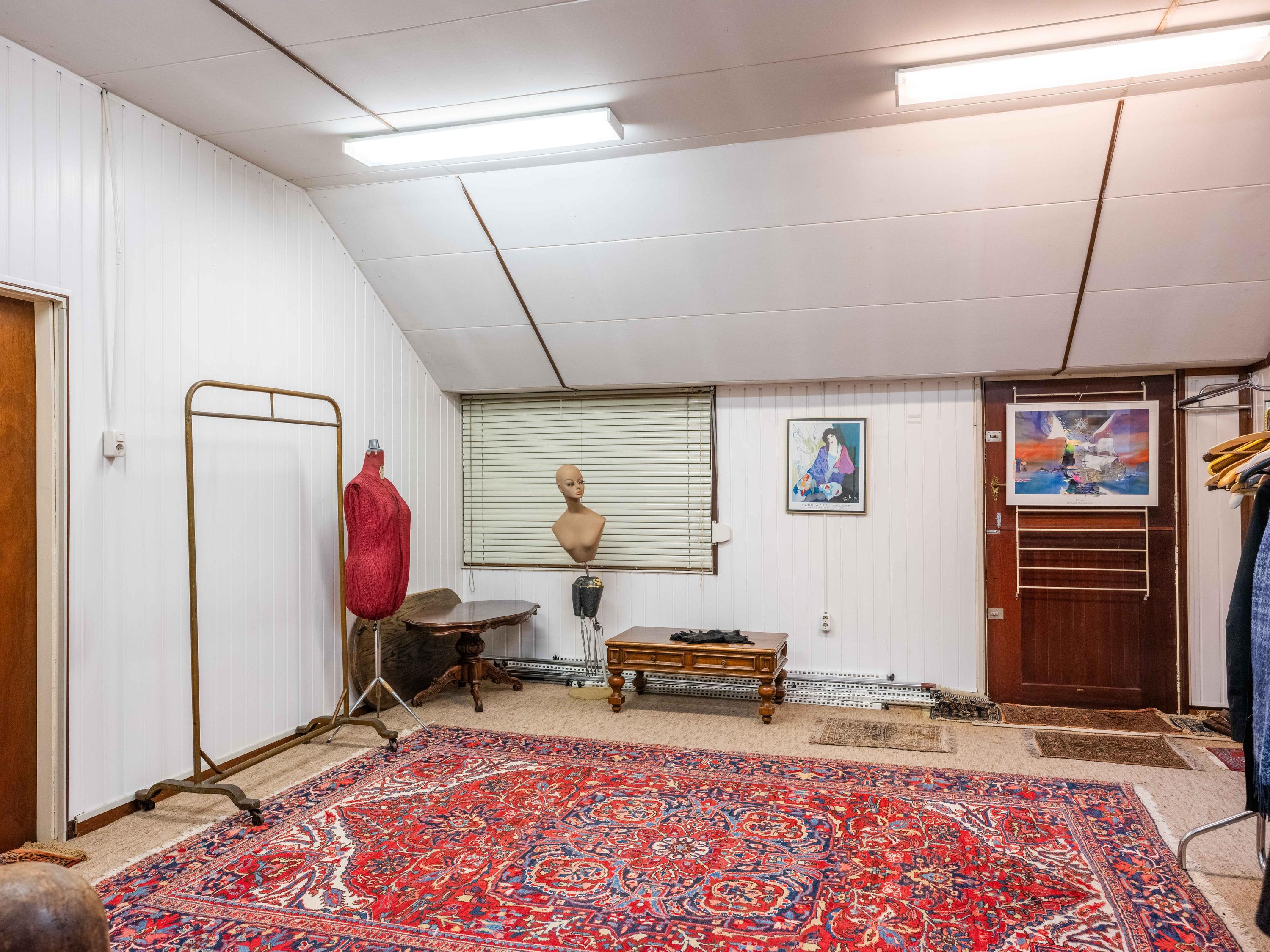 The front door on the right side of the house leads into the spacious hall. From here, the living room, kitchen with pantry and workshop with study can be reached. The staircase leads to the first floor with bedrooms and a simple bathroom with separate toilet. A fixed staircase takes us to the large attic room with dormer window from where you have a nice view of this authentic part of Bergen.