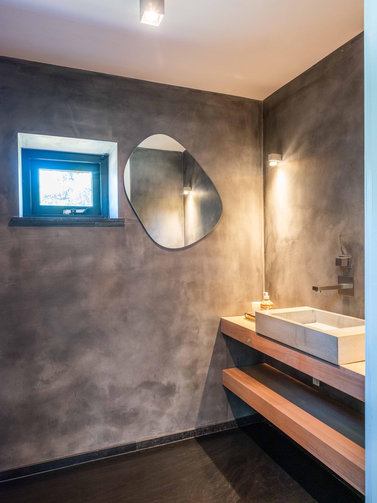 The living room where the ceiling, which reaches to the ridge, immediately catches the eye. The contrast of colours in the house enhance its sturdy character. This very spacious living room has a fireplace and French doors to the garden. The modern open kitchen is equipped with various built-in appliances, including a Boretti 8-burner cooker, an American fridge with coffee maker and plate warmer, oven, built-in fridge and dishwasher.