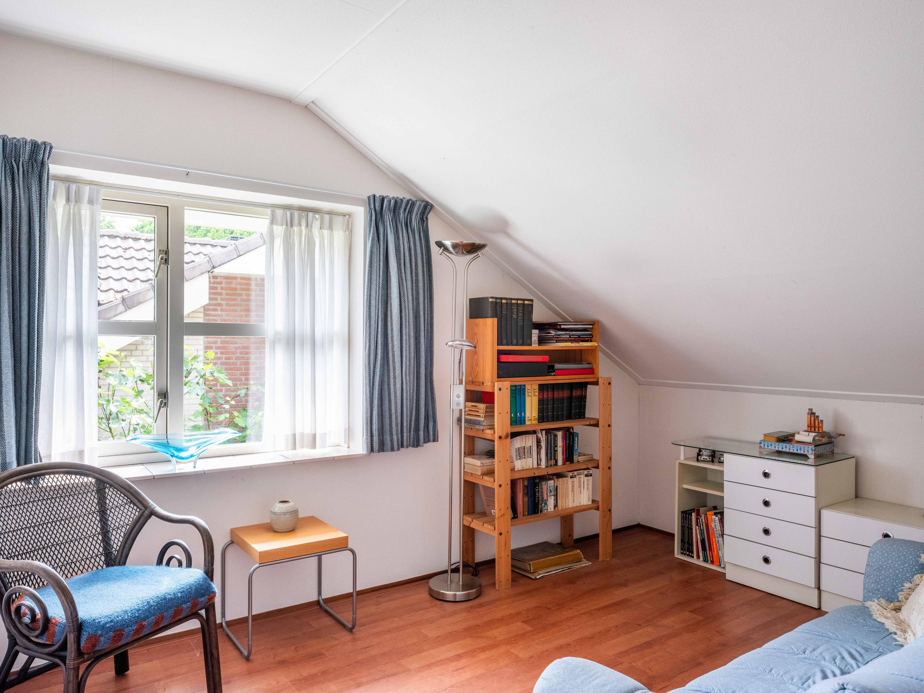On the ground floor, you will also find a spacious room on the garden side, which can be used as an office, but is also ideal as a bedroom. The bathroom on the ground floor has a bathtub with shower, double sink, and toilet.