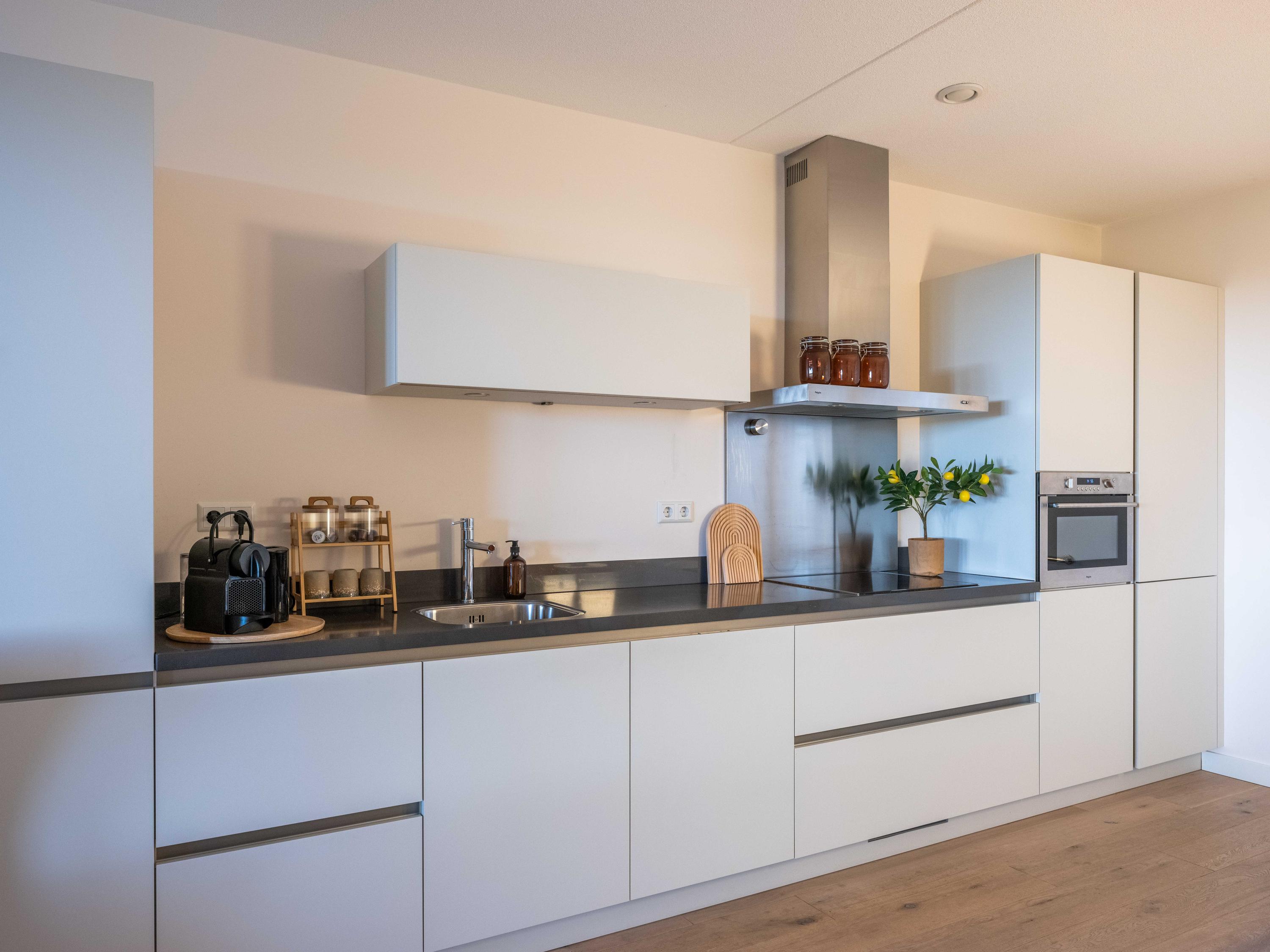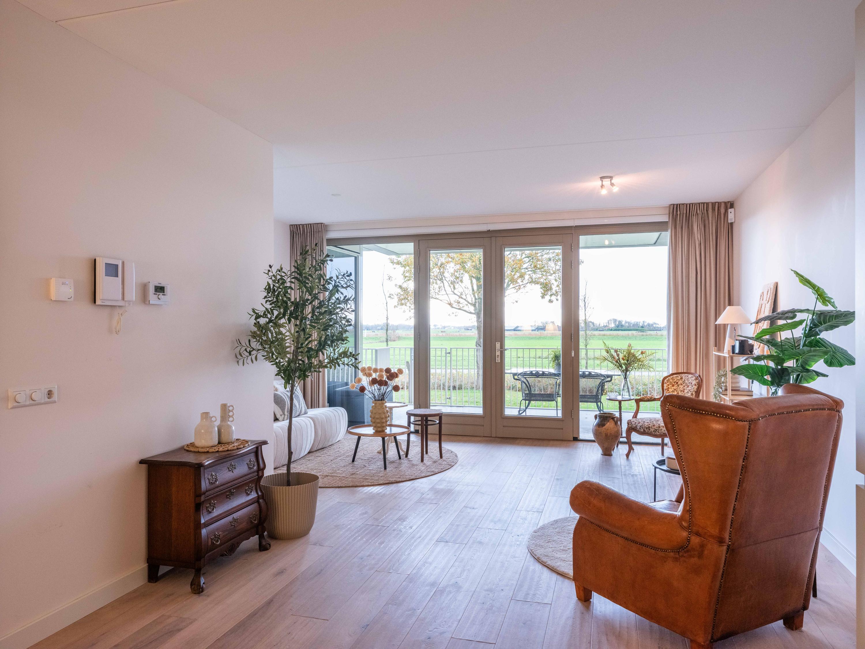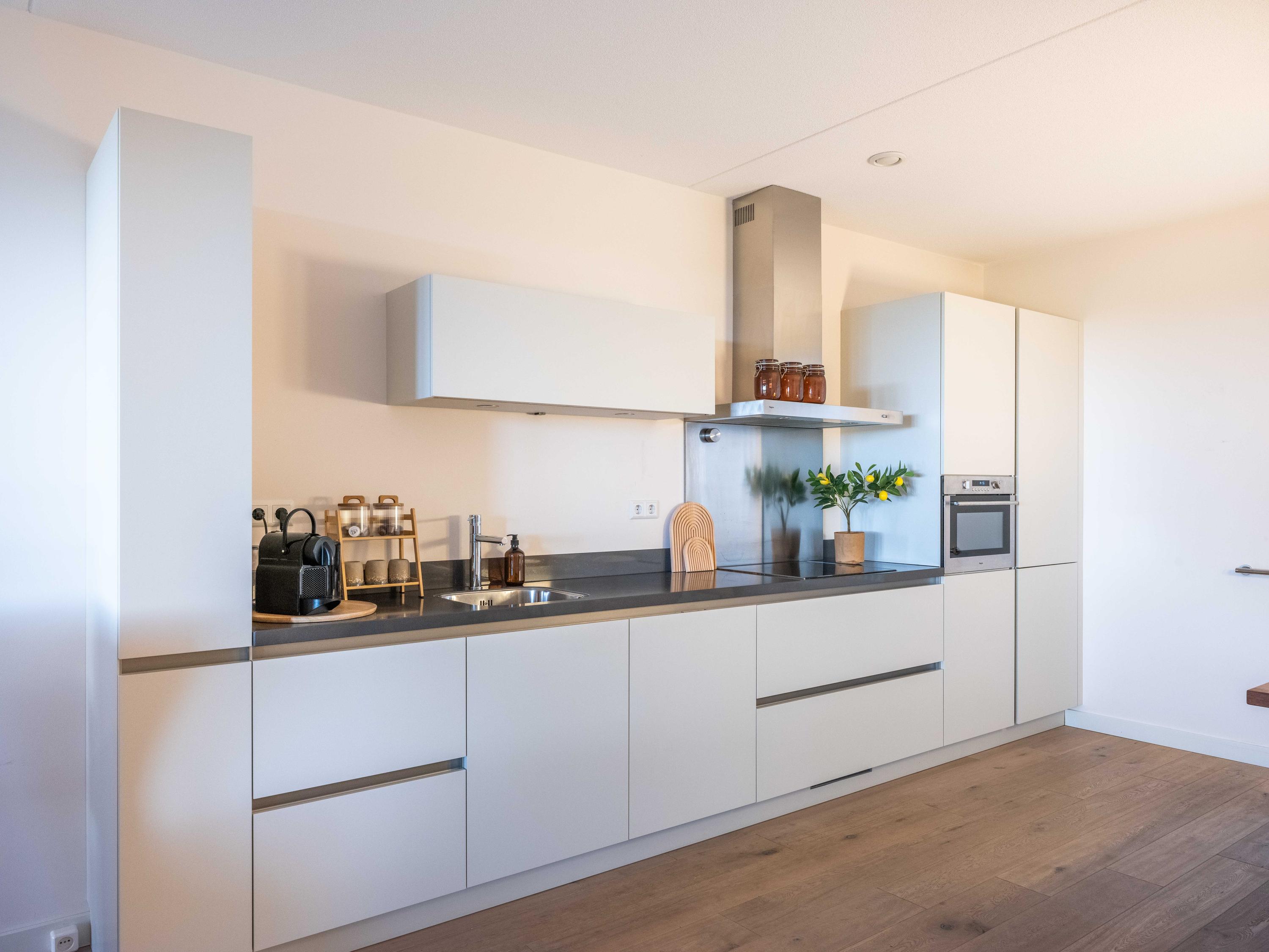From the living room, the balcony and the lower terrace, you can enjoy beautiful cloudy skies, birds and the greenery of the polder all day long. The modern open kitchen contains various built-in appliances and a dining area.