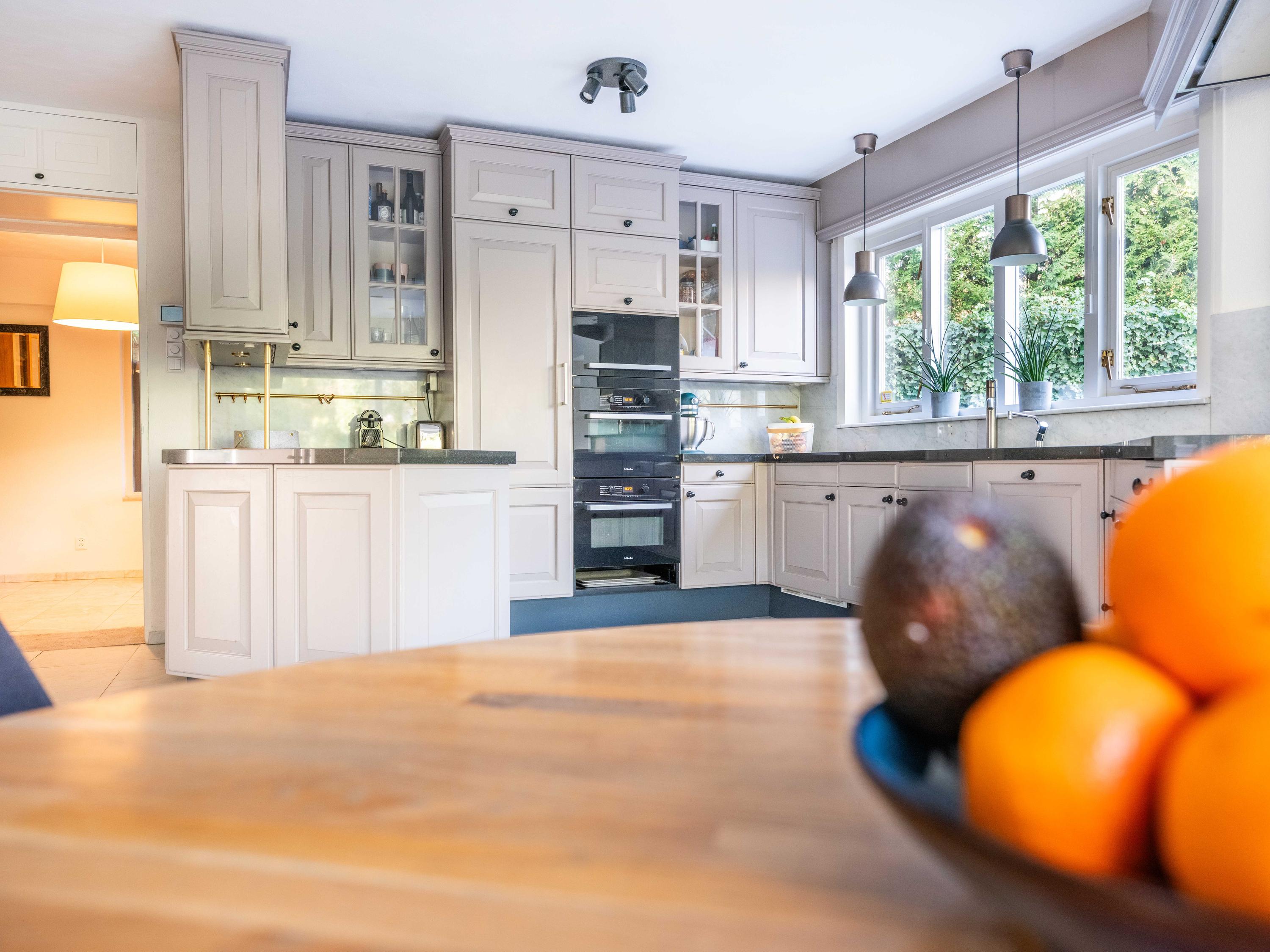 From the hall we enter the spacious kitchen, which is equipped with all kinds of appliances, such as a five-burner induction hob, quooker, steamer, two combi ovens etc. The cooking enthusiast can have a great time here.