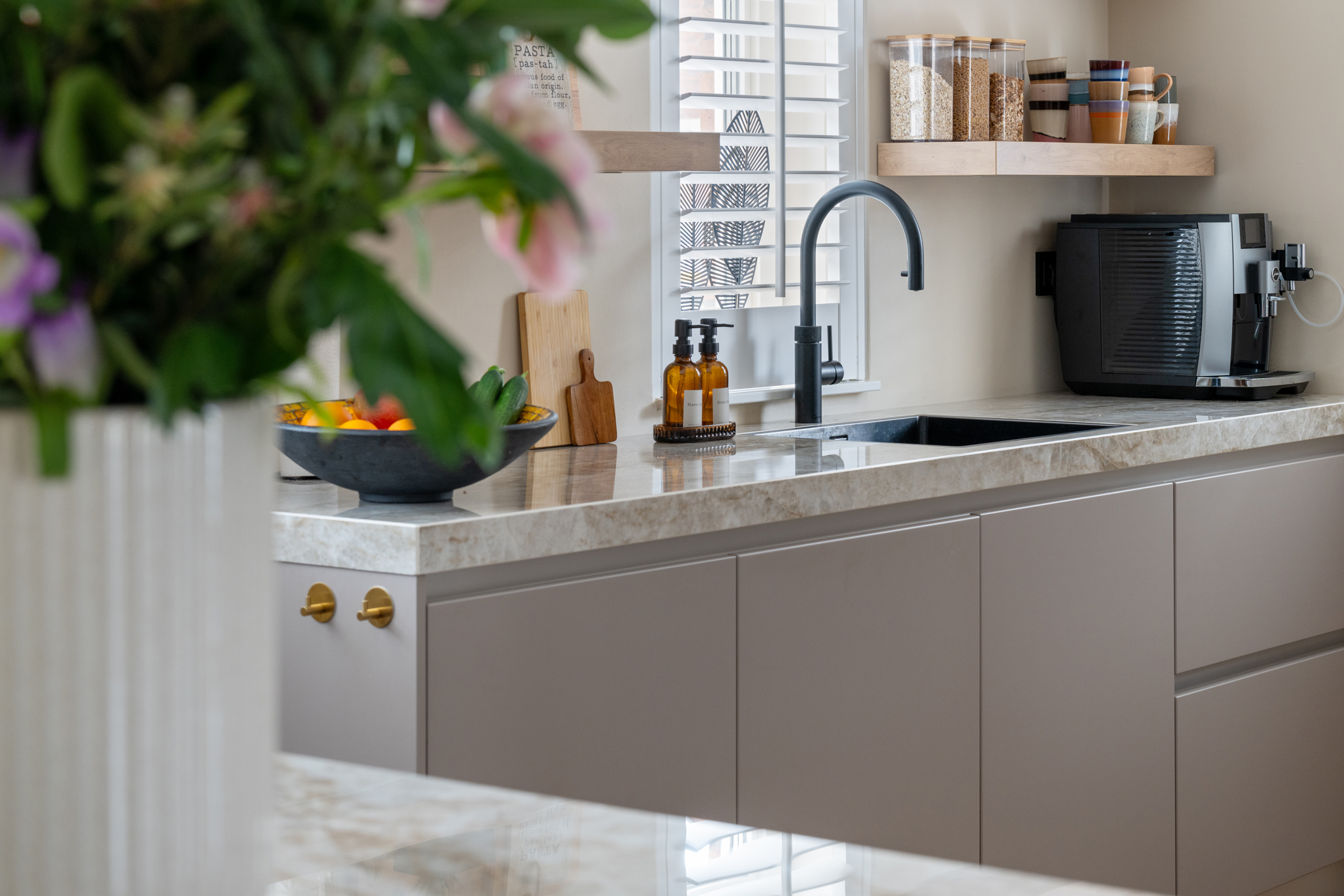 The inviting living room is bright and spacious, with the seating area at the rear. At the front, you’ll find the generous kitchen with a stylish island, finished with a luxurious marble countertop. The kitchen is fully equipped with high-end built-in appliances, including an induction cooktop with integrated extractor, oven, combination microwave, warming drawer, Quooker, fridge-freezer, and dishwasher.