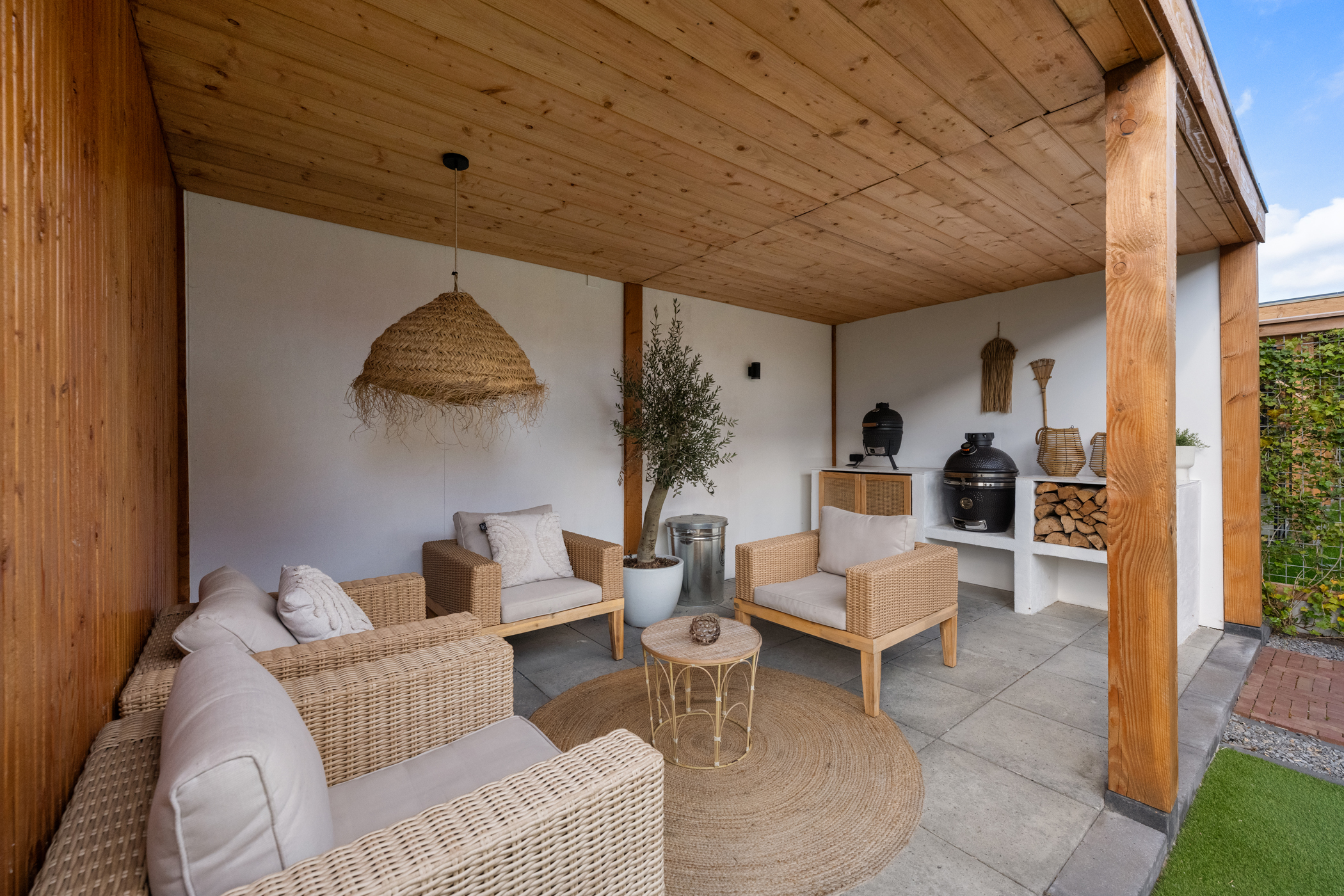 At the back is a charming covered area with storage: the perfect place to spend long evenings outdoors and enjoy the real outdoor life all year round.