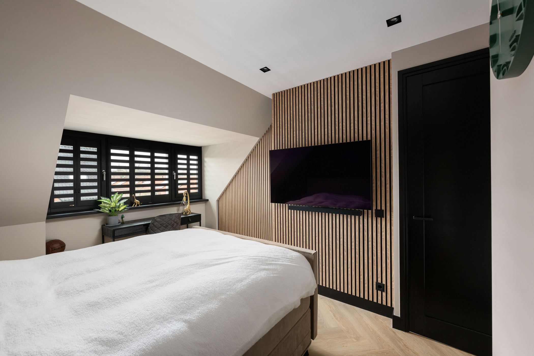 At the front you will find the third bedroom, equipped with air conditioning and built-in wardrobes hidden behind a stylish slatted wall.