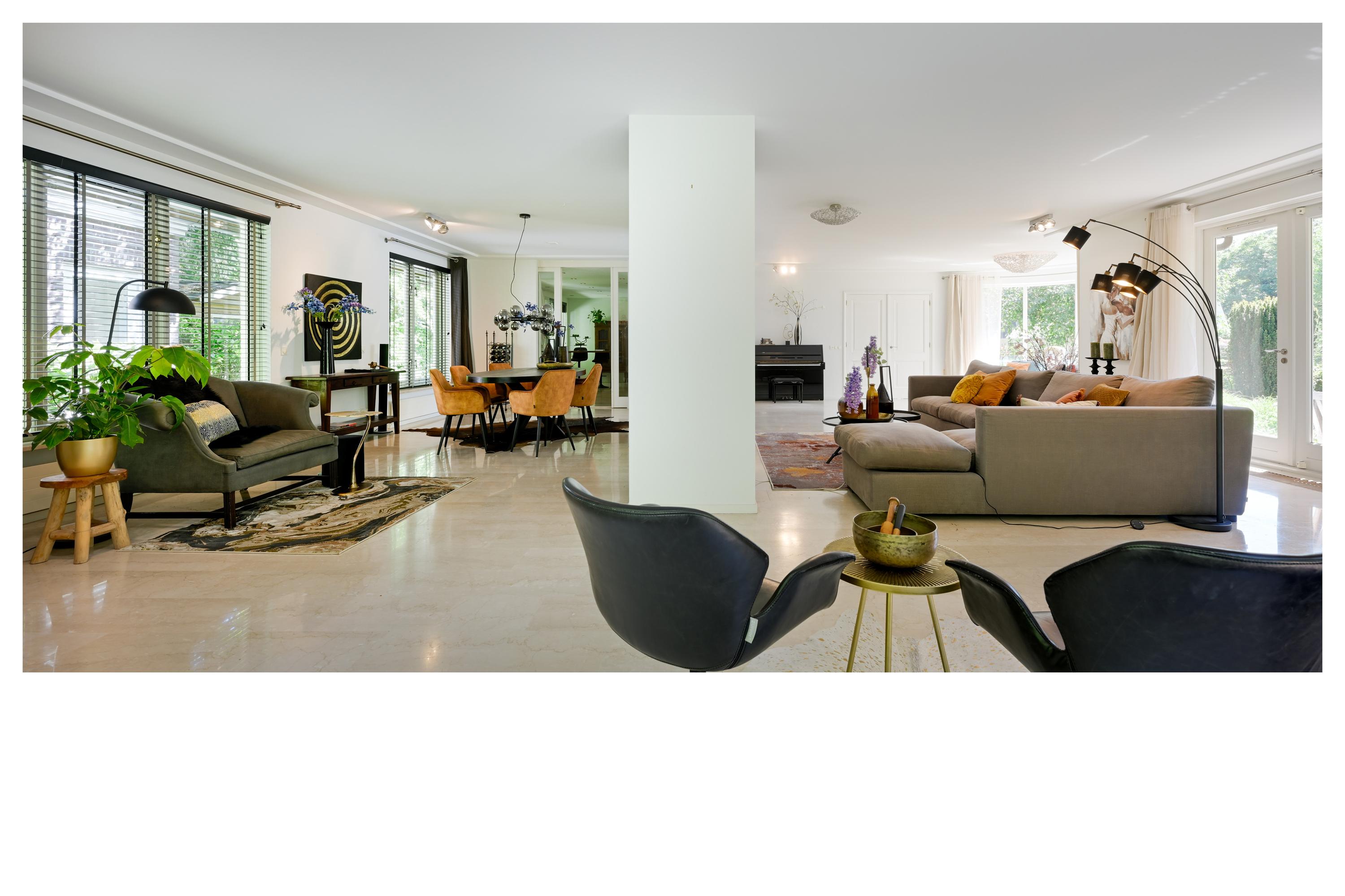Spacious hall with staircase and lift, modern toilet and cloakroom, double doors to bright, spacious living room with round bay window, cosy living room with (gas) fireplace and garden-facing bay window with French doors to the terrace (southwest), from the hall and living room access to the spacious, bright kitchen with multiple built-in appliances, utility room with connections for washing and drying appliances, door to the garden. Next to the hall is a study/workroom with custom-made curved cupboards and a bay window at the front.