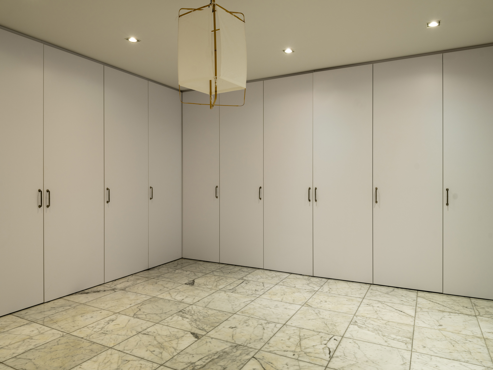 The dressing room features beautiful (custom-made) furniture with ample hanging and storage space. The bathroom is very spacious and equipped with a luxurious double bathtub, a large walk-in shower, a toilet, and a bidet.