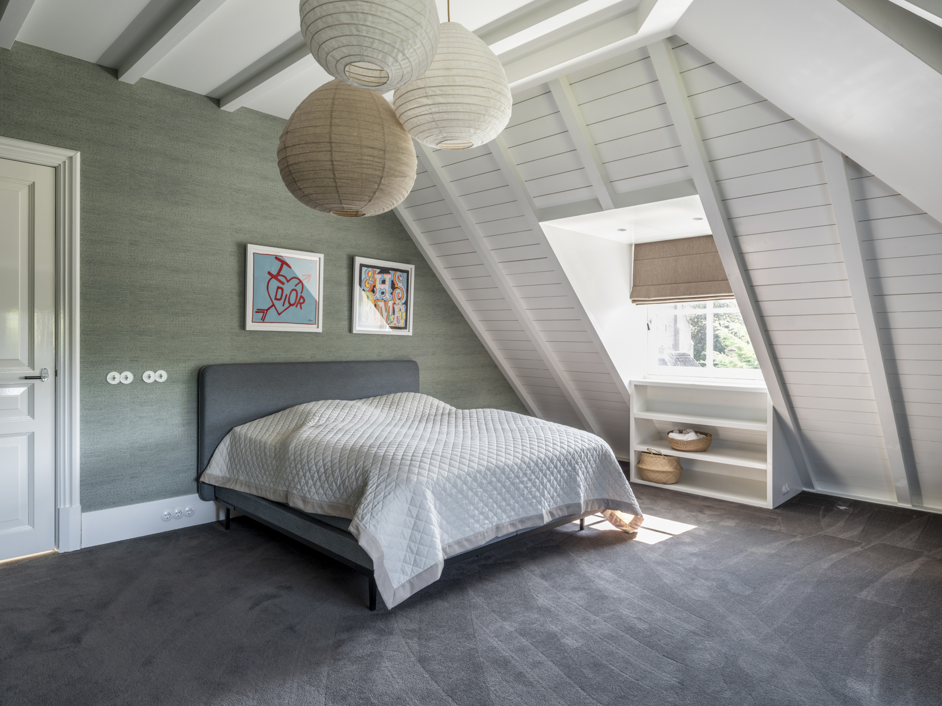 Via a wide staircase and spacious landing, you can reach the master bedroom (with balcony and view of the garden). The adjacent dressing room is openly connected to the master bathroom.