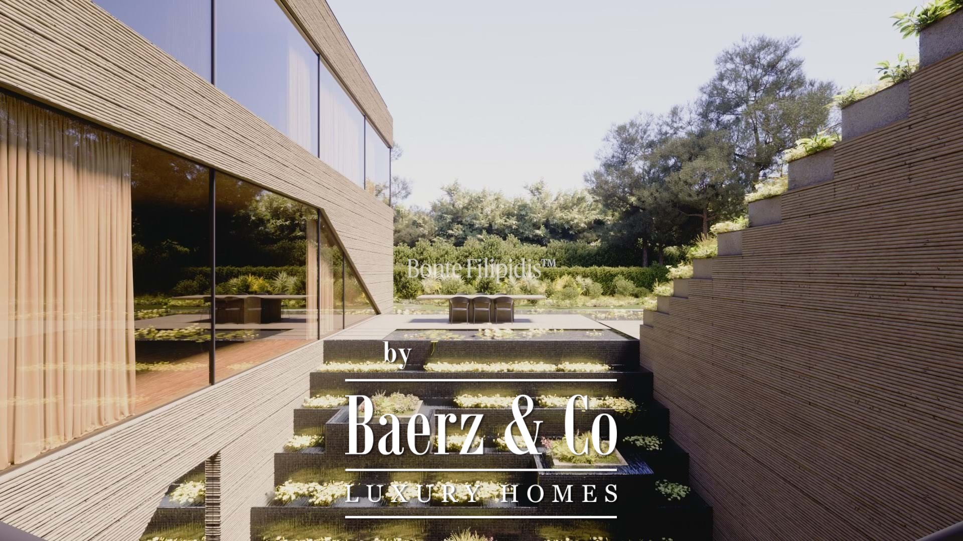 There are six en-suite bedrooms, including a master suite with private terrace and walk-in closet. The east and west-facing suites reveal serene views of landscaped gardens and water features. The lower level houses a gym, spa with sauna, laundry, technical areas, and a garage with electric gate for security.