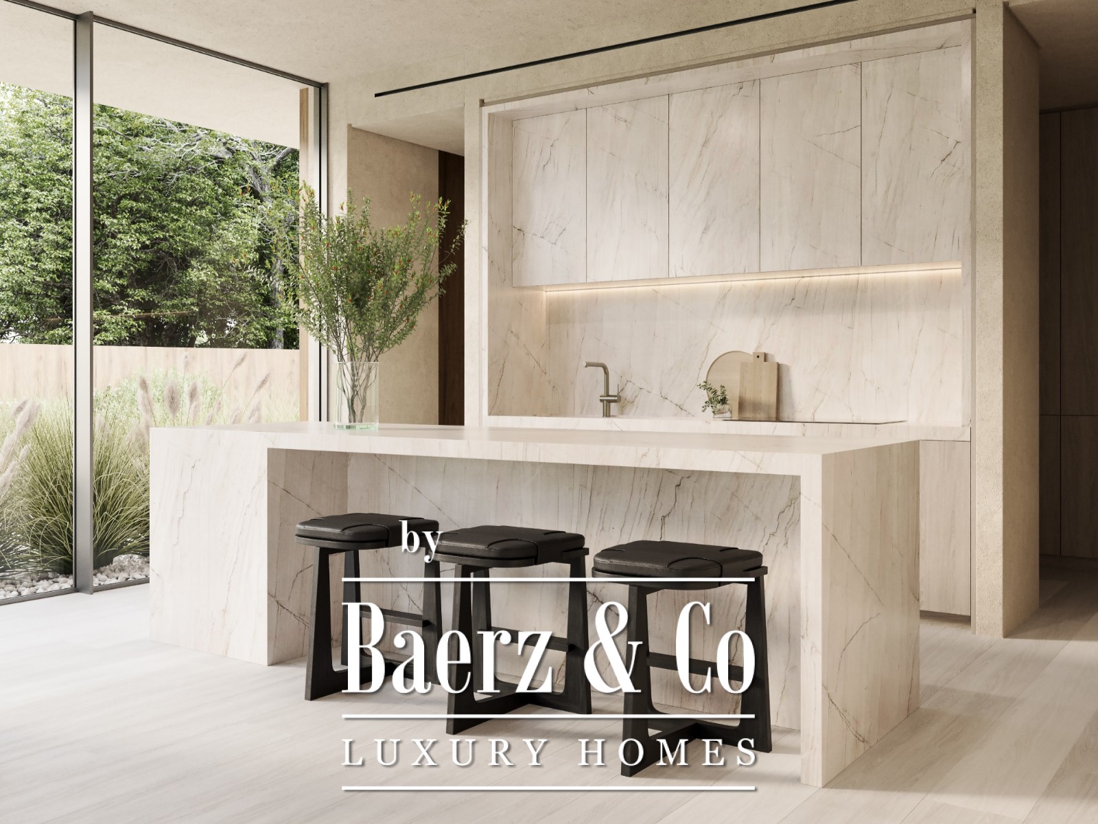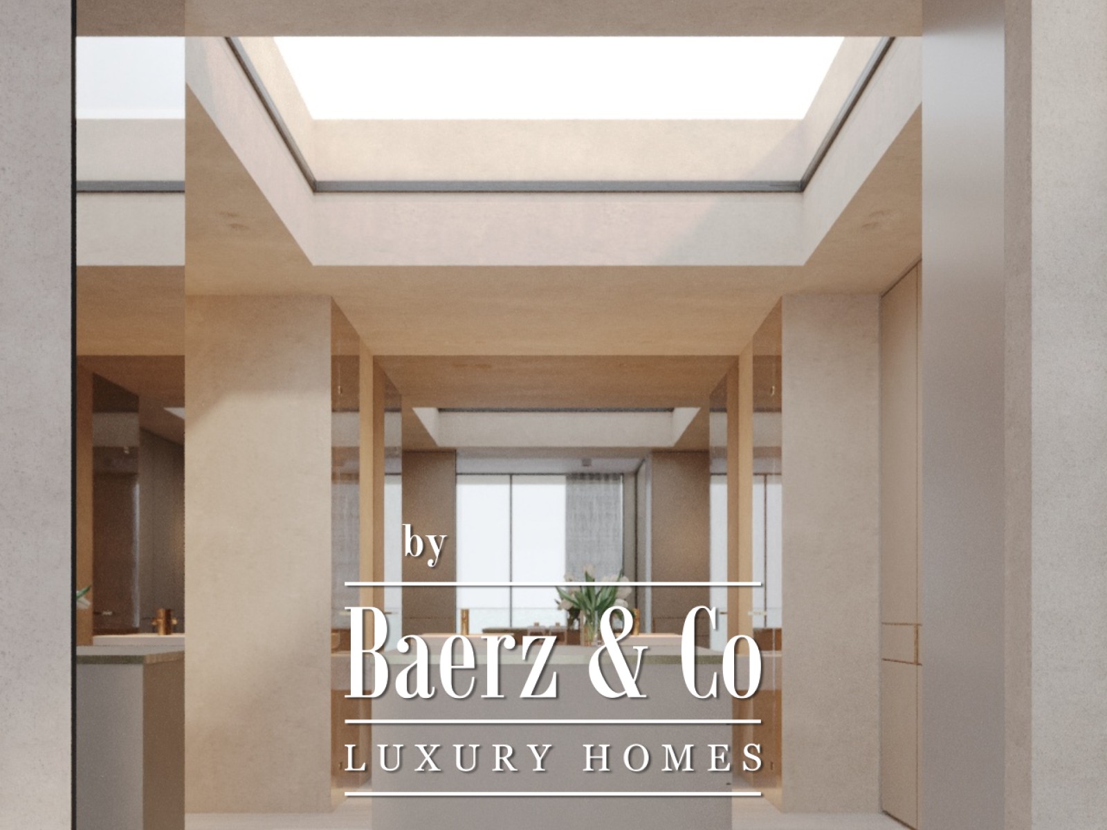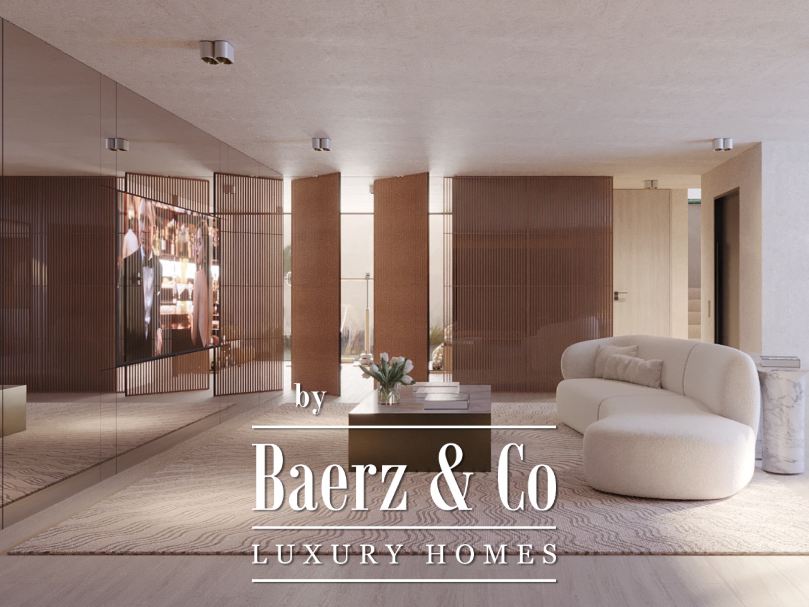 The lower level balances utility and leisure, featuring a spacious garage, a fully equipped gym, an indoor pool, a sauna, technical rooms and storage, as well as an informal living room and two bathrooms. The ground floor unfolds into an elegant living and dining area, a modern kitchen, home office, interior garden, and seamless access to an outdoor deck with a striking infinity pool—spaces that invite both relaxation and refined entertaining.
