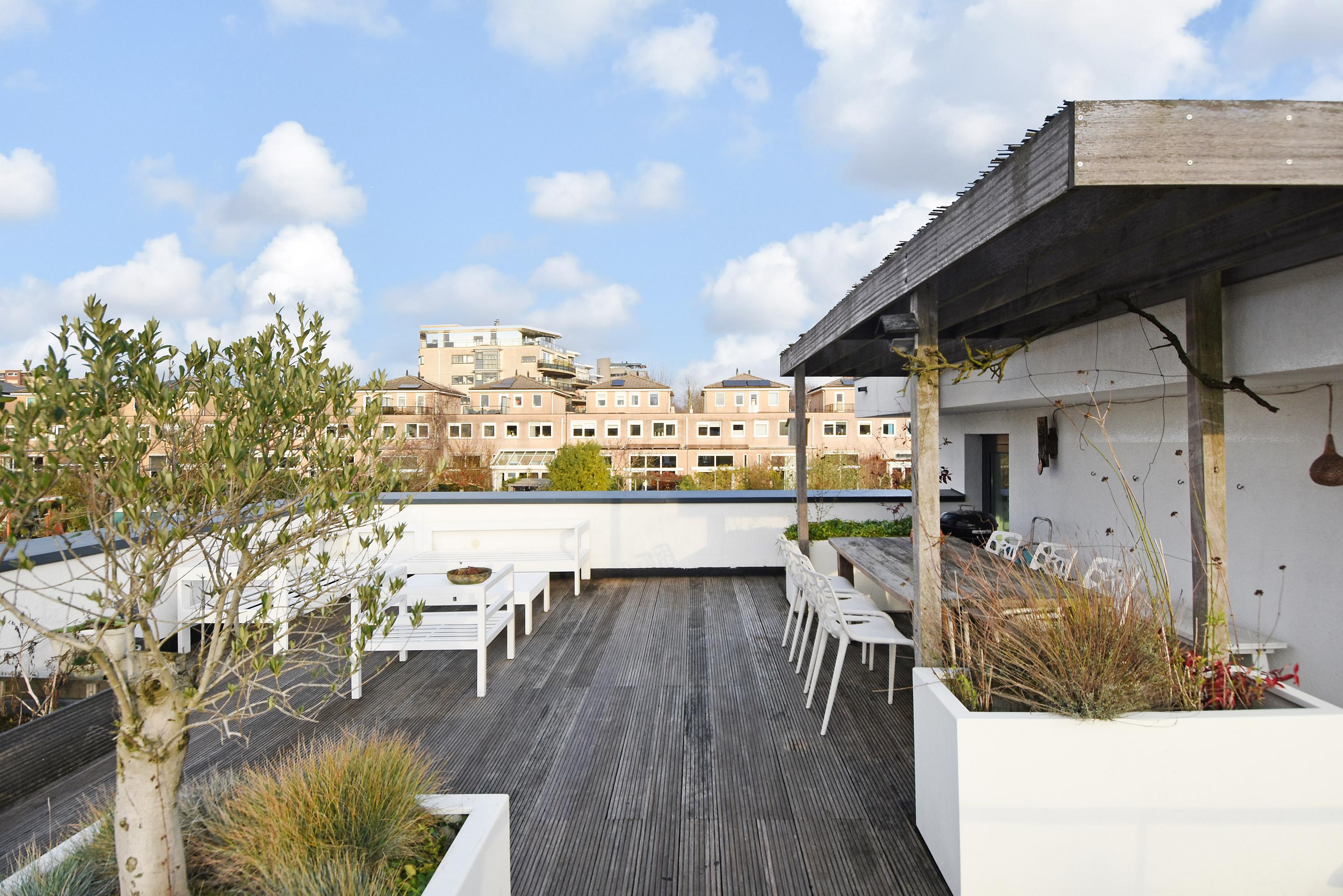 From the kitchen, a staircase leads up to the mezzanine, which can be used for various purposes (e.g. workspace, library, TV room). The biggest surprise is the beautifully landscaped and spacious roof terrace with lots of privacy and atmosphere, where you can enjoy the sun throughout the entire day.