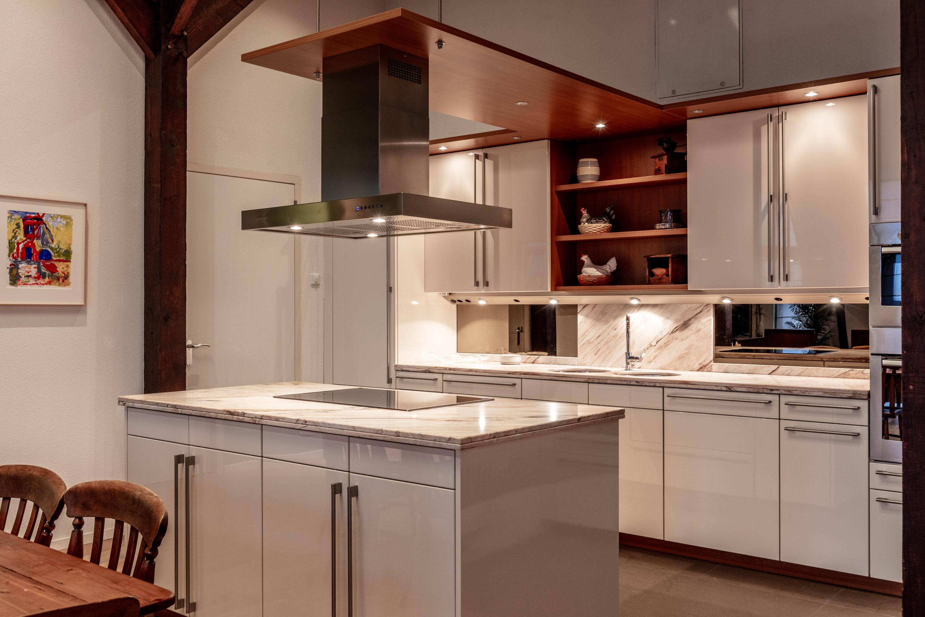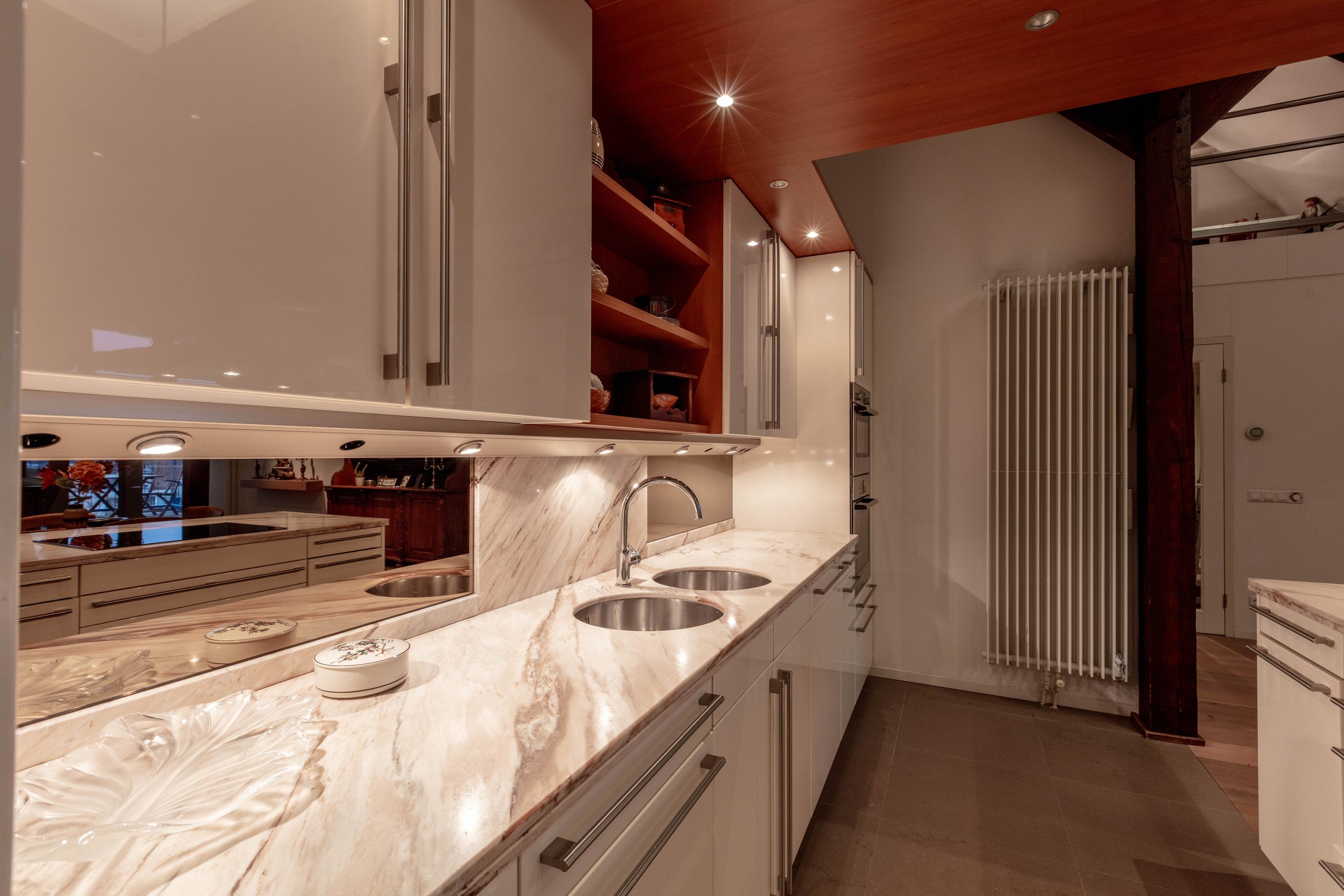 - De tijdloze keuken (Siematic) is voorzien van een marmeren aanrechtblad;