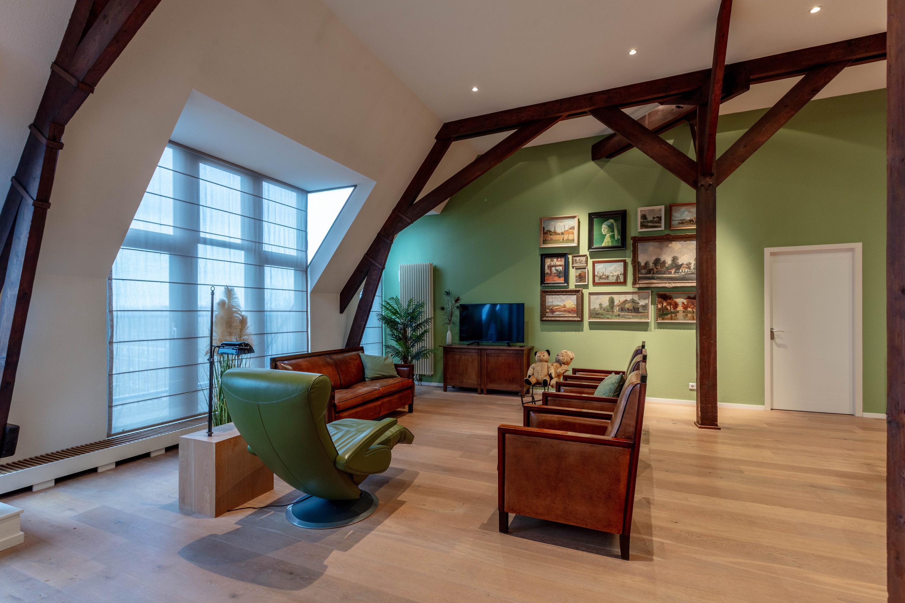 De bijzonder sfeervolle woonkamer is indrukwekkend door de unieke hoogte en fraaie zichtbare kapconstructie. De open keuken bevindt zich aan de achterzijde en beschikt over een kookeiland, volop kastruimte en diverse inbouwapparatuur. Vanuit de keuken is er prettig zicht op de woonkamer met een gezellig zitgedeelte en een apart eetgedeelte.