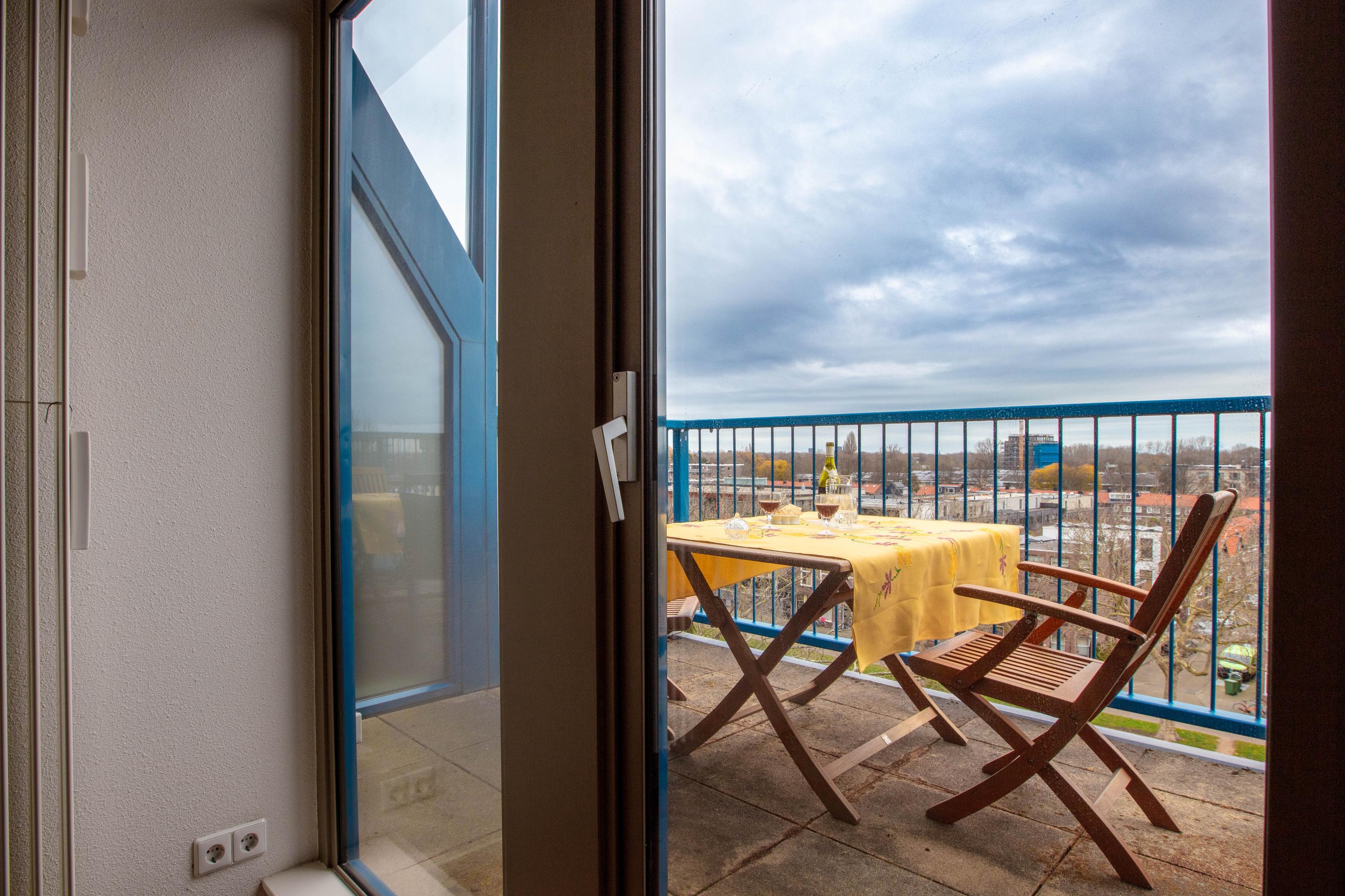 Via openslaande deuren is het terras bereikbaar, waar u heerlijk buiten kunt zitten met vrij uitzicht over Delft richting de Delftse Hout en over de Schie.