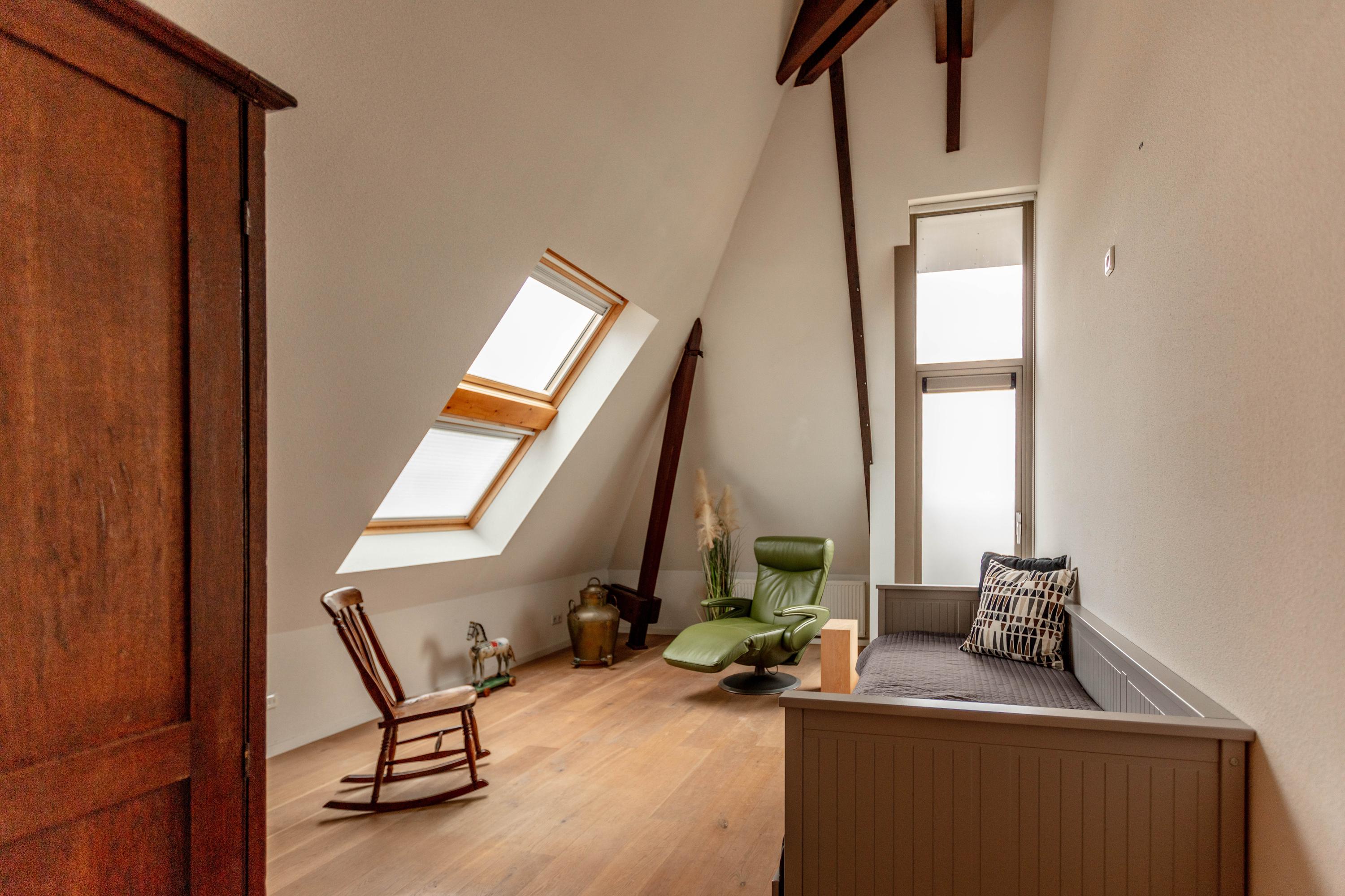 De tweede slaapkamer is ook voorzien van dakvensters en heeft eveneens een eigen badkamer met douche en wastafel.
