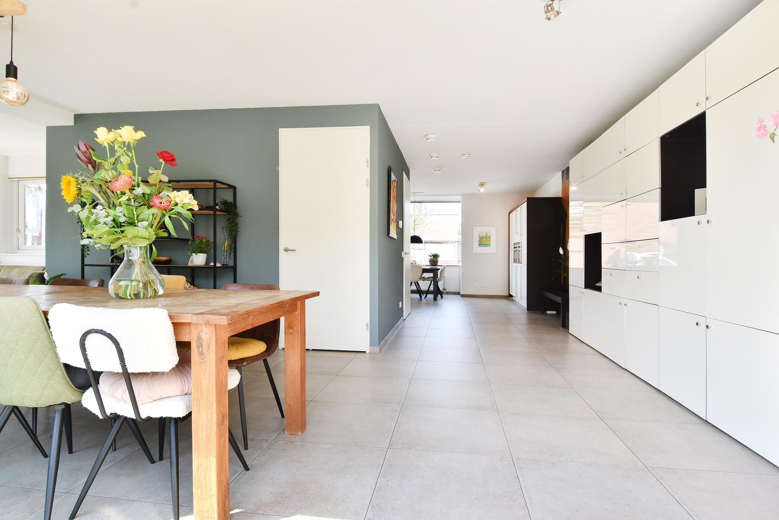 The spacious hall leads into the attractive, light-filled living room. The large sliding doors create a beautiful connection with the sunny garden. The garden has been recently landscaped and features lots of greenery, a lawn, a sunny terrace, a veranda and a canopy: a wonderful place to enjoy and relax all year round. The garden borders the water.
