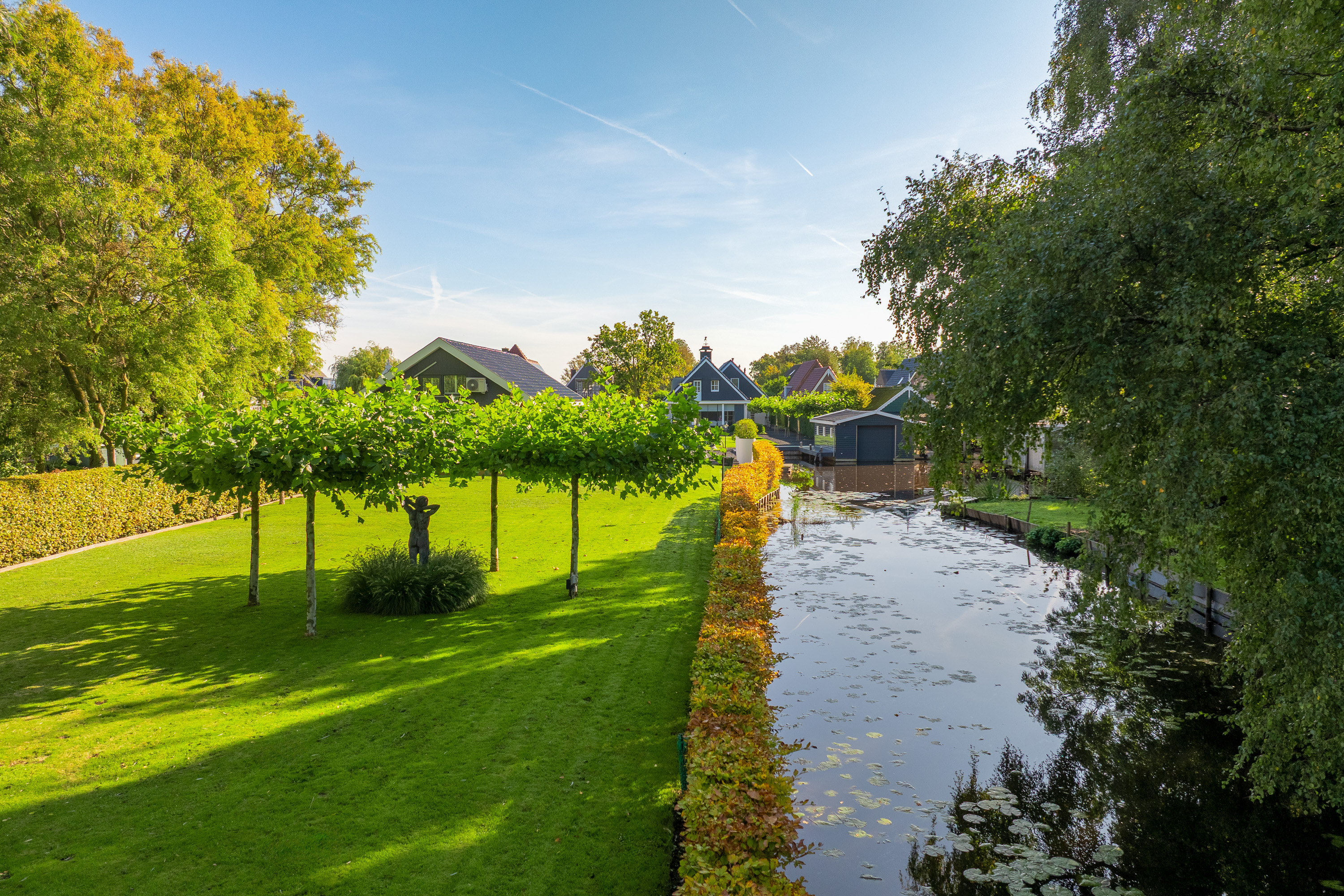 The beautifully landscaped garden is an oasis of peace and elegance. Sleek terraces, mature trees, and perfect positioning toward sun and water create an environment where privacy and relaxation take center stage. From the private boathouse, you step directly into your boat for a trip across open waterways — from Het Twiske to the canals of Amsterdam.
