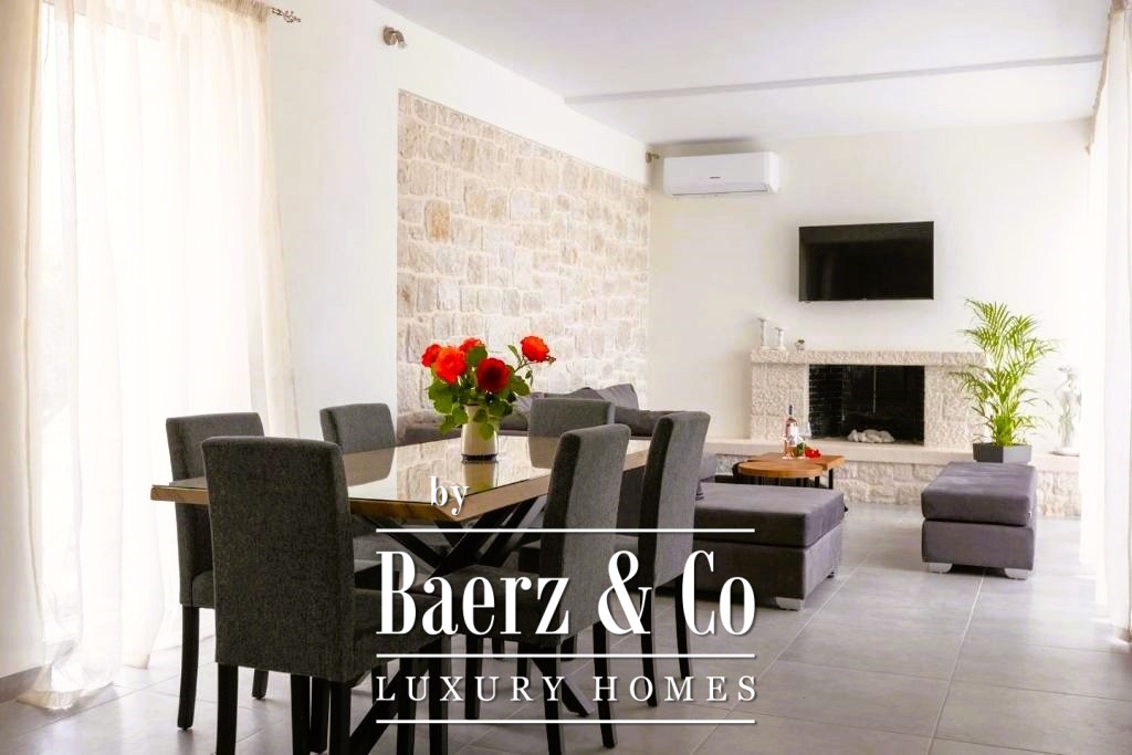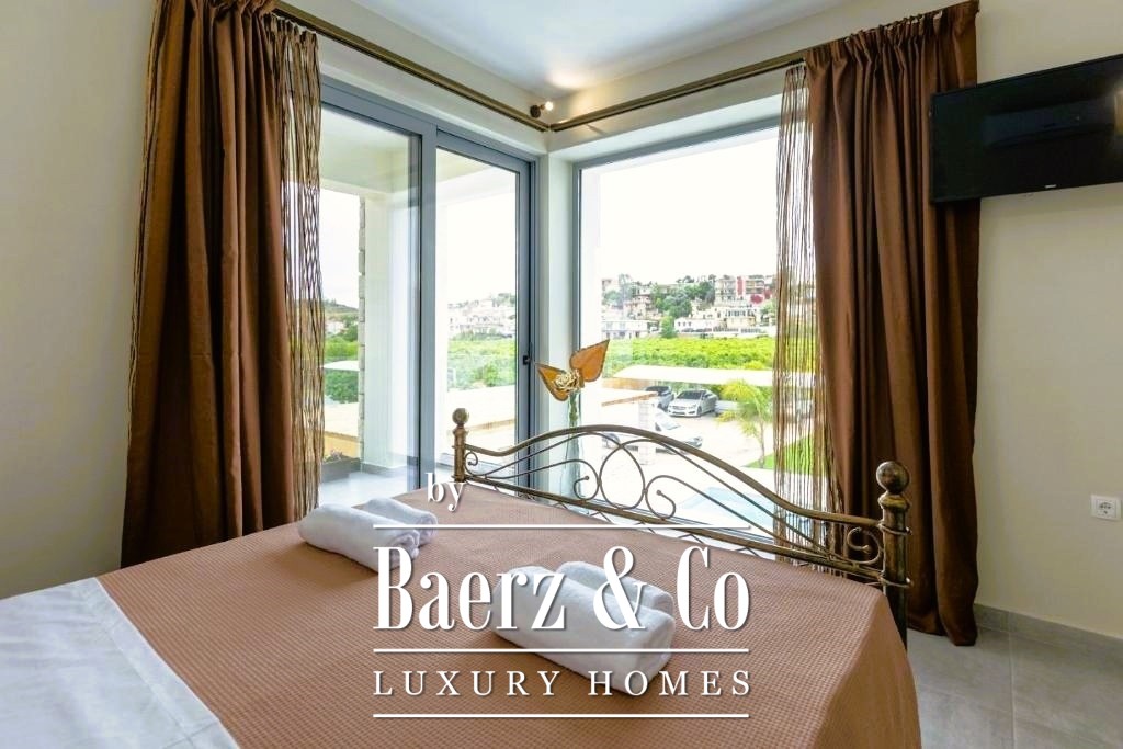 This detached house Drepano stands just 900 metres from the Ionian coast, set within a 2,251 m² private plot embraced by mature trees and palm landscaping. The residence presents 170 m² of architecture that balances contemporary comfort with openness to sea views and natural light. On the ground level, a generous living room centres around a fireplace, leading to a semi-separate kitchen, a guest WC, and a principal suite oriented to the pool. Ascend to the first floor to discover three spacious master bedrooms, each with its own bath, flowing onto balconies that capture unobstructed views and Mediterranean light.
