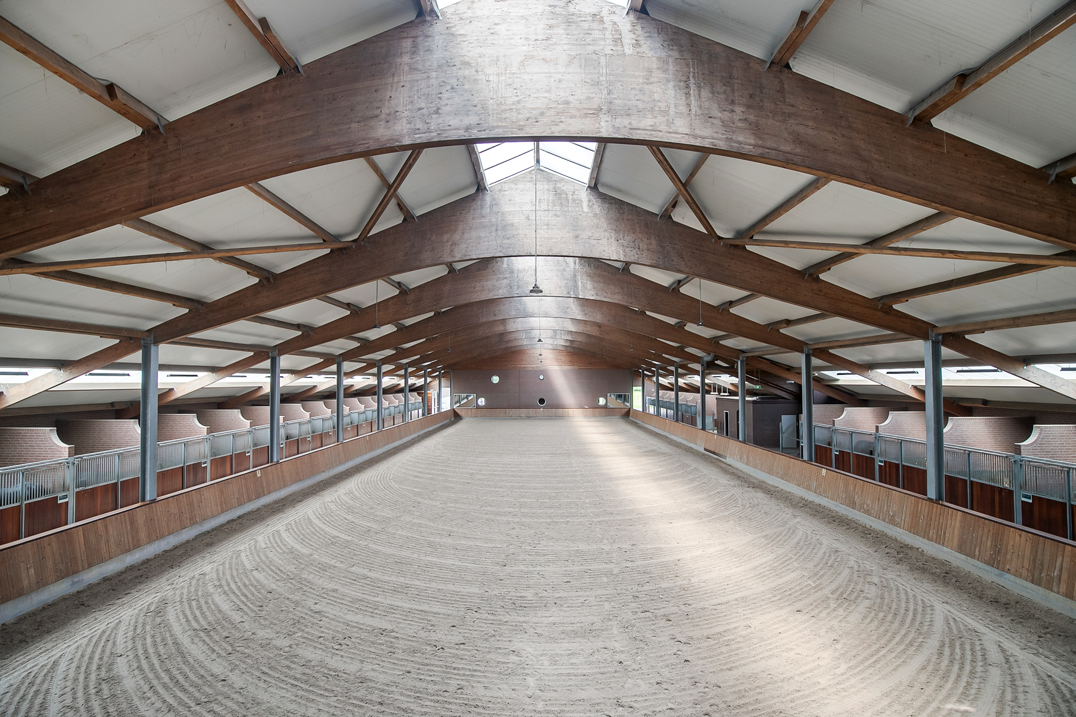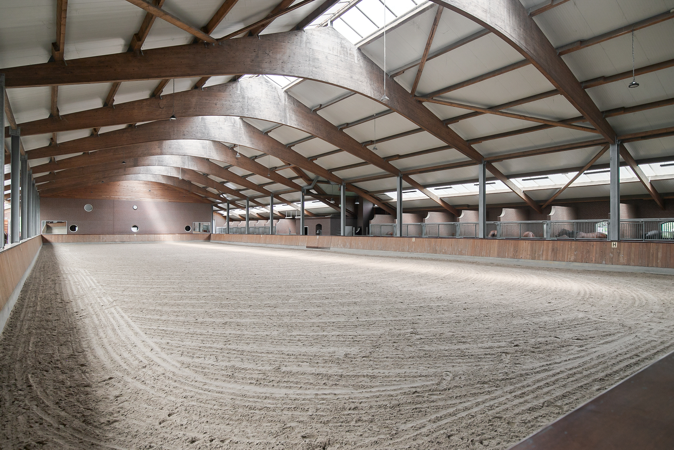 The riding hall is built of masonry facades with rafters. A skylight in the ridge and above the stables provides plenty of natural light. French doors in the front facade provide access.