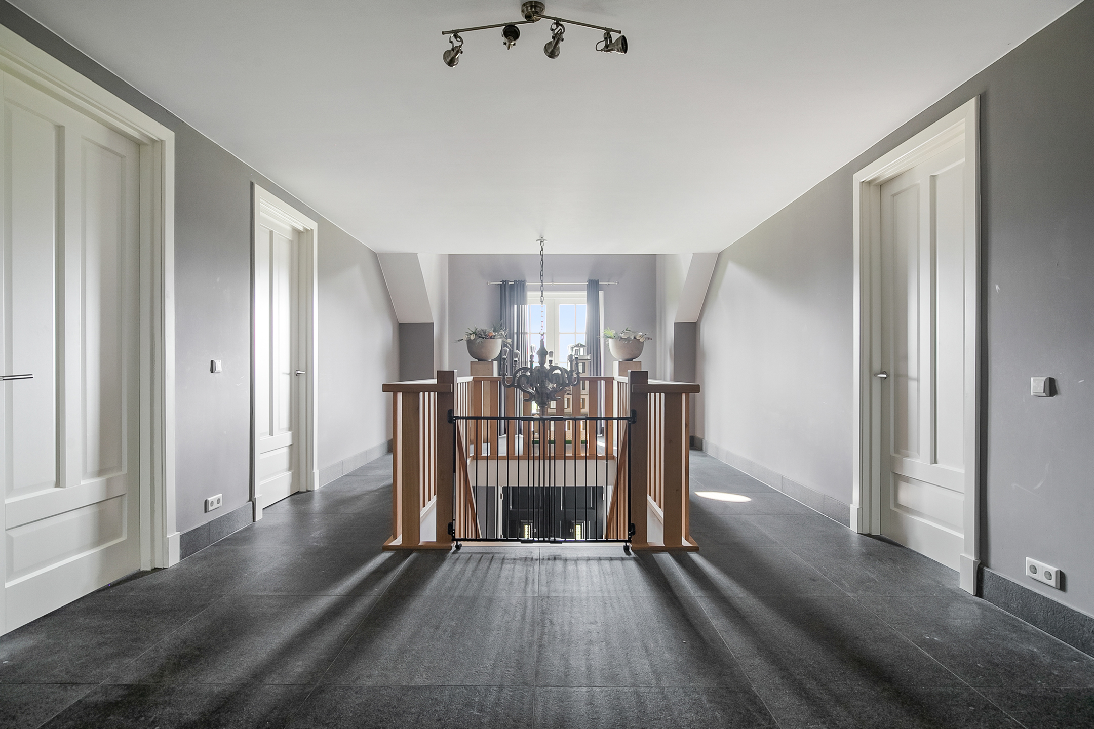 The spacious landing with loft provides access to 3 spacious bedrooms, the bathroom, toilet room and the attic. There is also access to a charming French balcony which offers nice views of the surrounding area. The landing and all bedrooms have the same finish, natural stone floor, stucco walls and a stucco ceiling.