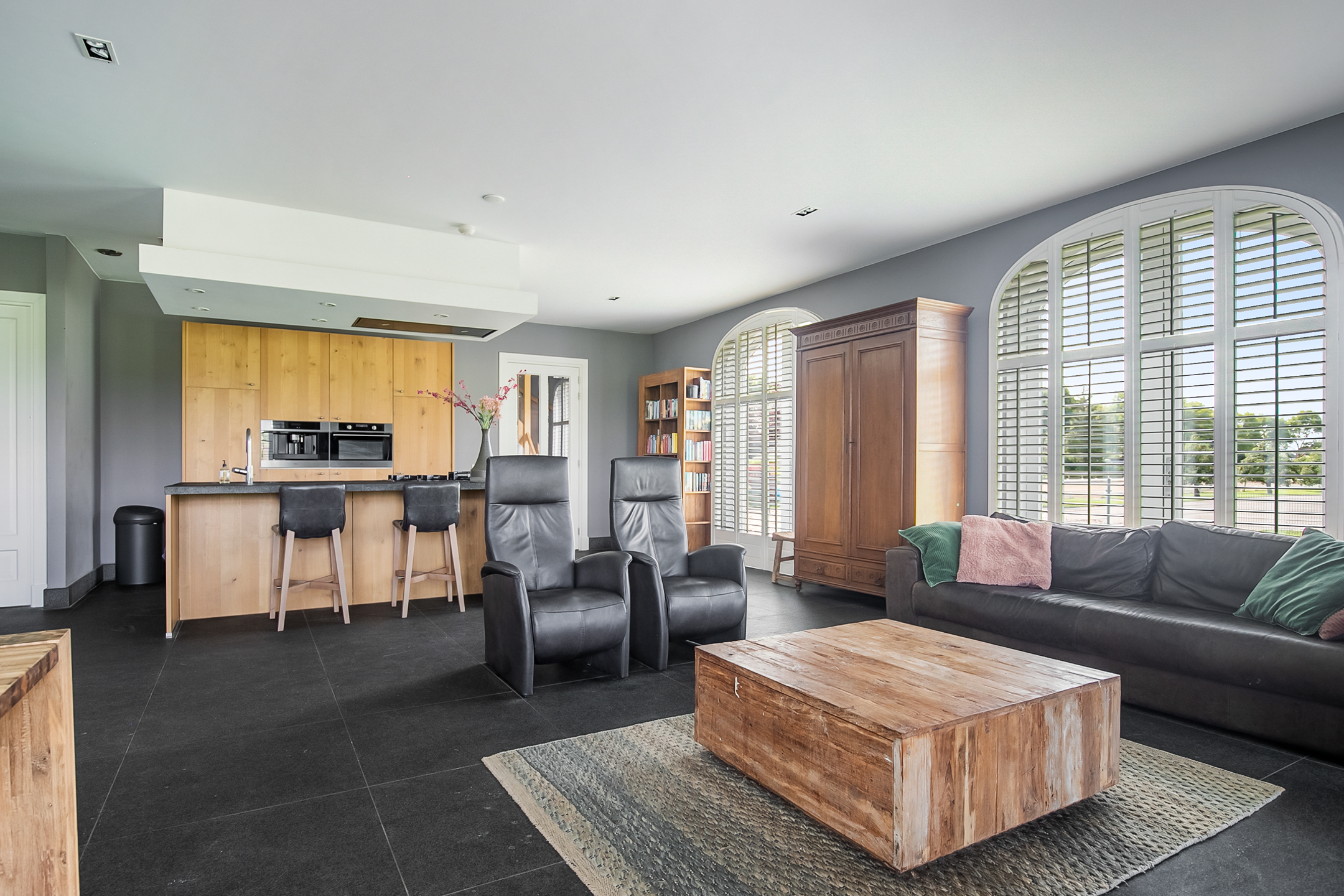 The covered entrance with a double sliding front door, gives this villa an attractive appearance. The spacious reception hall with imposing wooden staircase provides access to the living room and the 1st floor. The hall has a natural stone tiled floor, stucco walls and a stucco ceiling. The spacious living kitchen with dining area has a natural stone tiled floor, stucco walls and a stucco ceiling with recessed lighting. The kitchen features a wall-mounted unit with appliance wall and a cooking and rinsing island. The appliance wall is further equipped with an oven, coffee maker, steam oven and fridge. The island features a 5-burner gas hob with built-in extractor fan in the ceiling, a sink and a dishwasher. Various cupboards and drawers provide plenty of storage space. A large bay window/extension with French doors provide access to the garden. The many windows provide plenty of natural light. A fireplace adds atmosphere and warmth to the room. From the living room there is a nice view of the horse pastures. And here, too, large windows and double doors provide a sea of light. In addition, there is a beautiful, large fireplace with a gas fire that provides even more atmosphere and warmth in the room. Sliding doors close off the living room from the kitchen/dining area. Semi-circular French doors in the side wall of the house provide access to the front house. The spacious entrance hall provides access to the utility/laundry room, living room, toilet room and the meter cupboard. The utility/laundry room is equipped with a sink. Also located here are the connections for the washing equipment. From here, there is access to the office/workroom. The office space is a fine room which is obviously suitable for various purposes, such as a playroom or chill room.