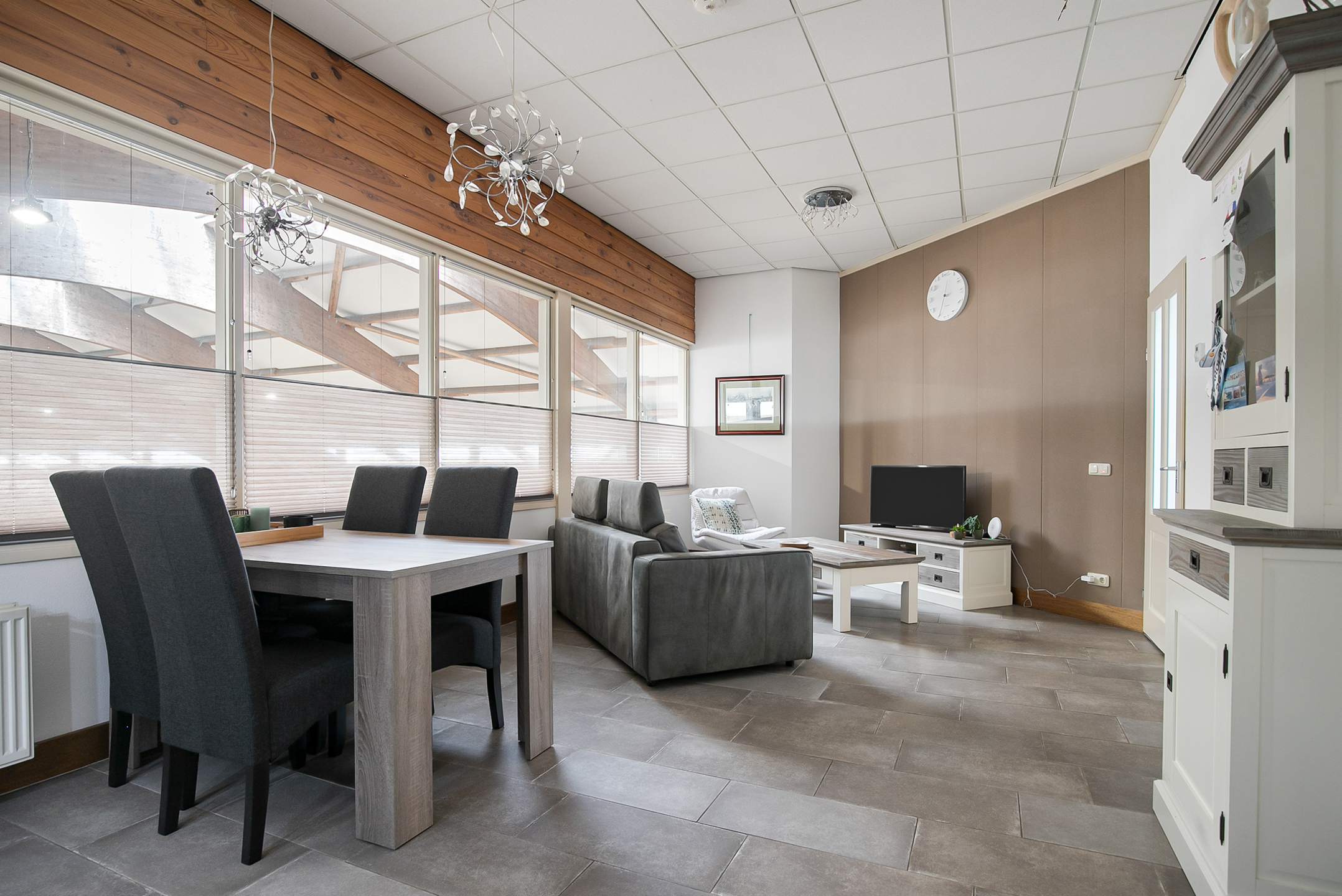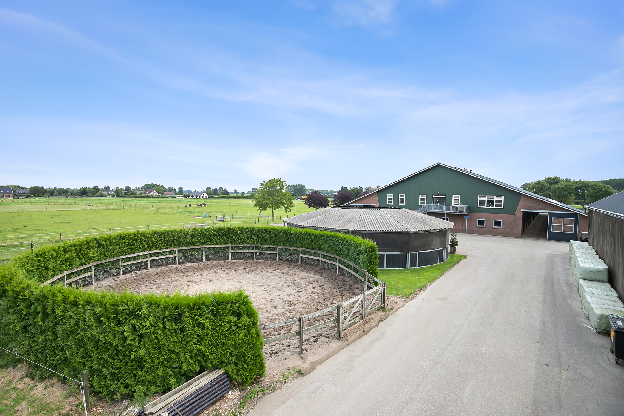 The hall at the front of the riding hall has a cobbled floor and provides access to a storeroom, toilet rooms, laundry room and a shop area. A spiral staircase provides access to the 1st floor. The reception area and a flat are located here. The reception area has a tiled floor, stucco walls and a suspended ceiling. There is a kitchenette and bar. French doors provide access to a balcony at the front of the riding hall. Large windows offer nice views of the indoor arena and stables. There is also access from the reception area to a balcony above the indoor arena.The flat is equipped with a living room with open kitchen, 2 bedrooms and a spacious bathroom. The flat has a tiled floor. The kitchen unit features a sink, induction hob, dishwasher, fridge and combination microwave. The bathroom is fully tiled and further equipped with a shower room, washbasin with cabinet and a floating toilet. A laundry room is located behind a practical sliding wall. The indoor arena (approx. 21x61 m) is equipped with a professional soil (Ben Agterberg), a beautiful hardwood arena edge. Vaulted wooden rafters add to the atmosphere. A skylight in the ridge provides beautiful natural light. LED lighting is also available. The 39 horse stalls are divided over two stall corridors. The stalls have partly hardwood / partly galvanised front walls and masonry partitions and rear walls. The doors of the stalls are hinged. The stalls are also equipped with an outside hatch. Each stall corridor has its own facilities such as washing areas and a tack room. Between the corridors there are three spacious loose boxes. The washing areas are equipped with hot and cold water supply. There is also a place for the farrier and physio. There is another flat at the rear. Access is gained via a flight of stairs on the outside. There is also a balcony here. The flat features a spacious living room with open kitchen, 3 bedrooms, a spacious bathroom, a utility room, laundry room and a toilet room.At the rear of the plot is a detached field barn situated. The barn is constructed of masonry skirting with sheet pile walls and the insulated roof is covered with sandwich panels. At the front, the field barn is fitted with windbreak netting. There is a feed silo in the barn. There are currently 14 horse boxes and a lunging circle, but this barn is of course also extremely suitable for various other purposes.