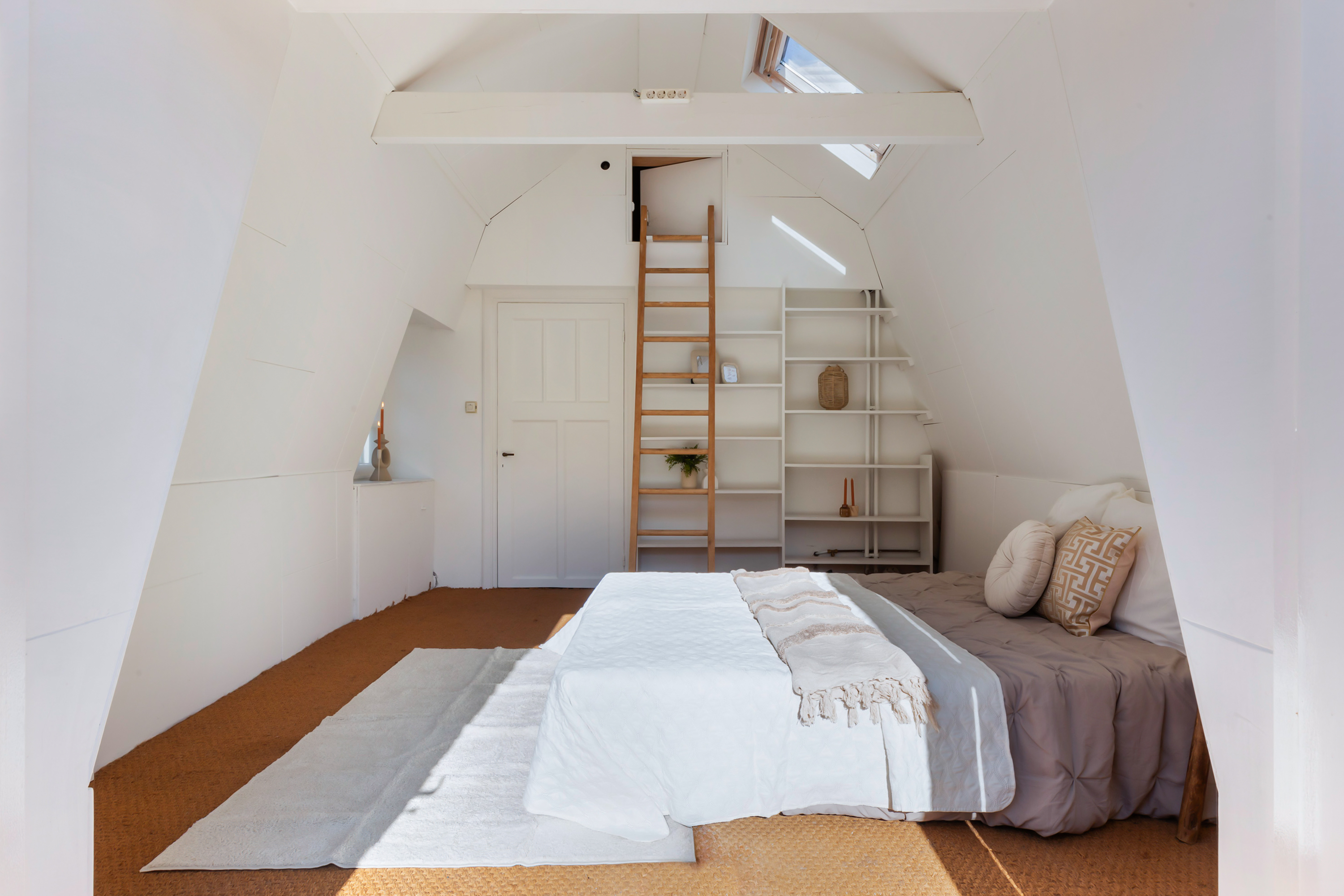 The spacious landing leads to the bedrooms and bathroom. The bedrooms are light and airy, with wooden flooring and smooth plastered walls. Four of the bedrooms are large enough to accommodate a double bed. Two have built-in wardrobes, the turret room has a charming corner window, and two others have French doors to the roof terrace. The fourth bedroom is connected to the bathroom and could also serve as a guest room. From this room, a fixed staircase leads to a small loft. The fifth room is currently used as a study but could just as easily serve as a dressing room, nursery or walk-in wardrobe.