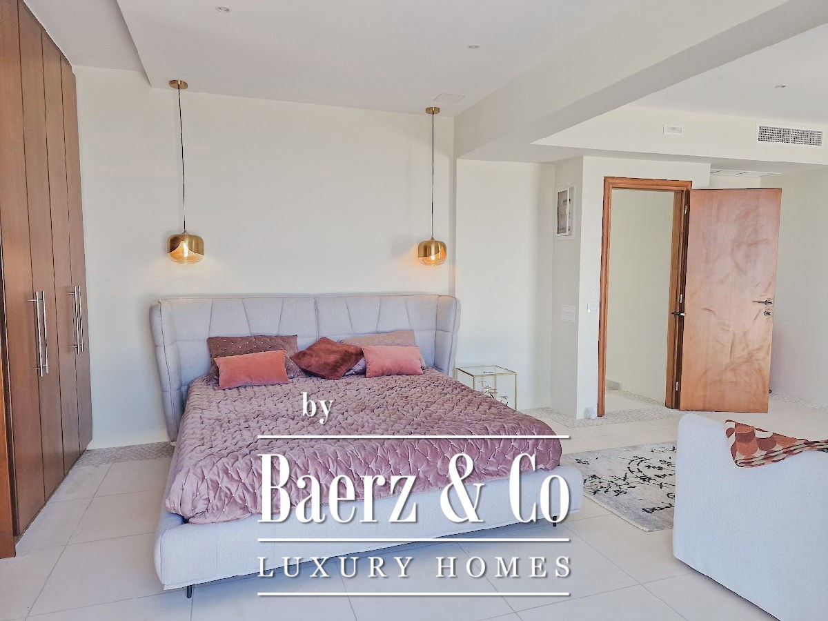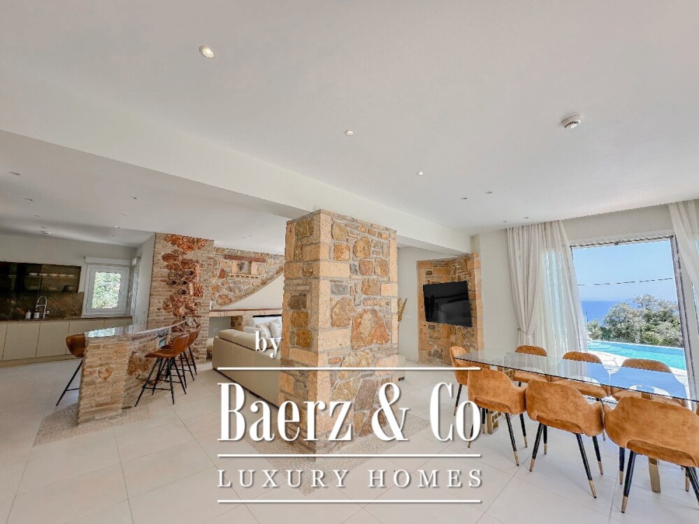 The top floor is dedicated to an impressive master suite, where a jacuzzi and 50 m² of terraces capture unobstructed sea and mountain views, immersing the living space in natural light. Outdoors, a tall stone perimeter ensures privacy, while a meticulously landscaped garden and pool area unfold toward the horizon, embracing panoramic vistas.