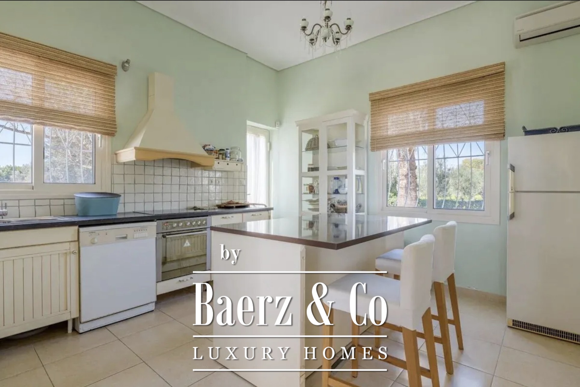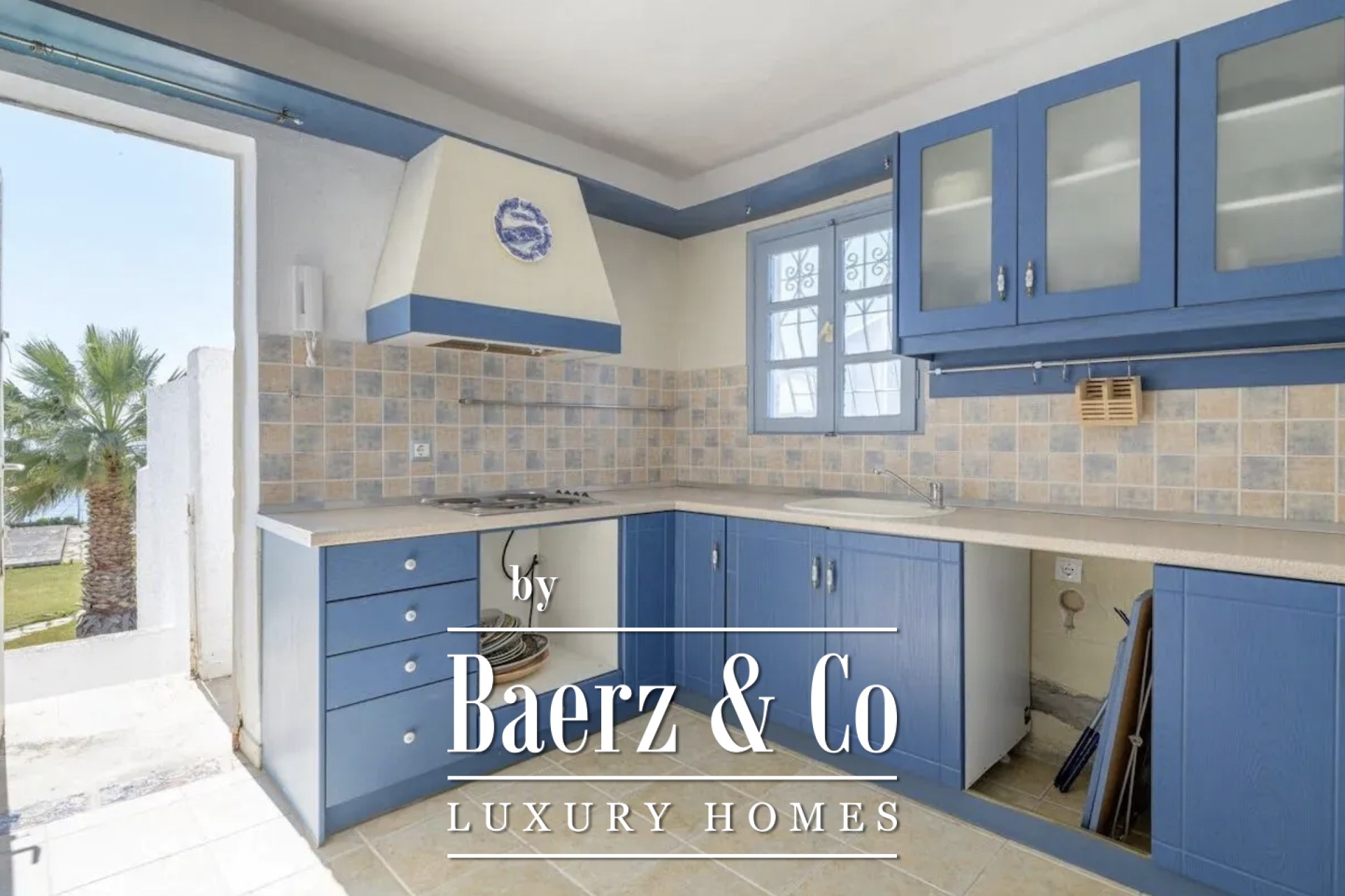 The ground floor extends over 150 m² and comprises an expansive living and dining area with a fireplace, flowing out into the landscaped garden. Natural light floods the space, highlighting four bedrooms, two bathrooms, a large kitchen, laundry room, and direct access to outdoor lounging areas. Above, the 100 m² upper floor features its own living and dining space with fireplace, three bedrooms, one bathroom plus guest WC, a second kitchen, and a wide terrace where sunset over the open Aegean becomes daily ritual. The possibility of renovation adds further scope for personal expression and value.