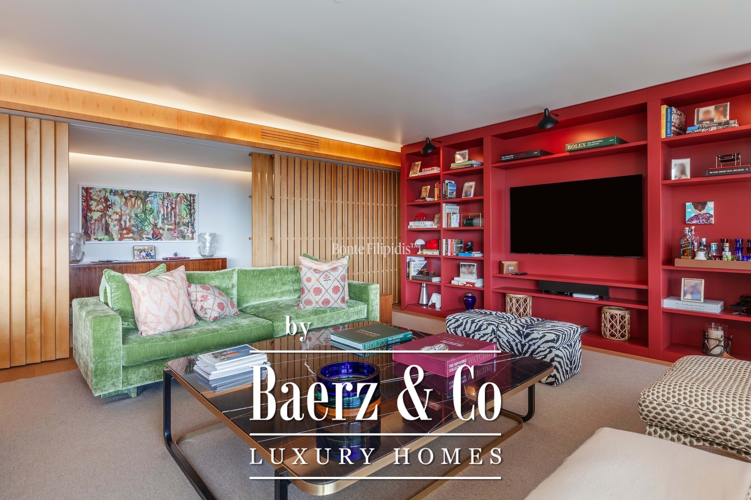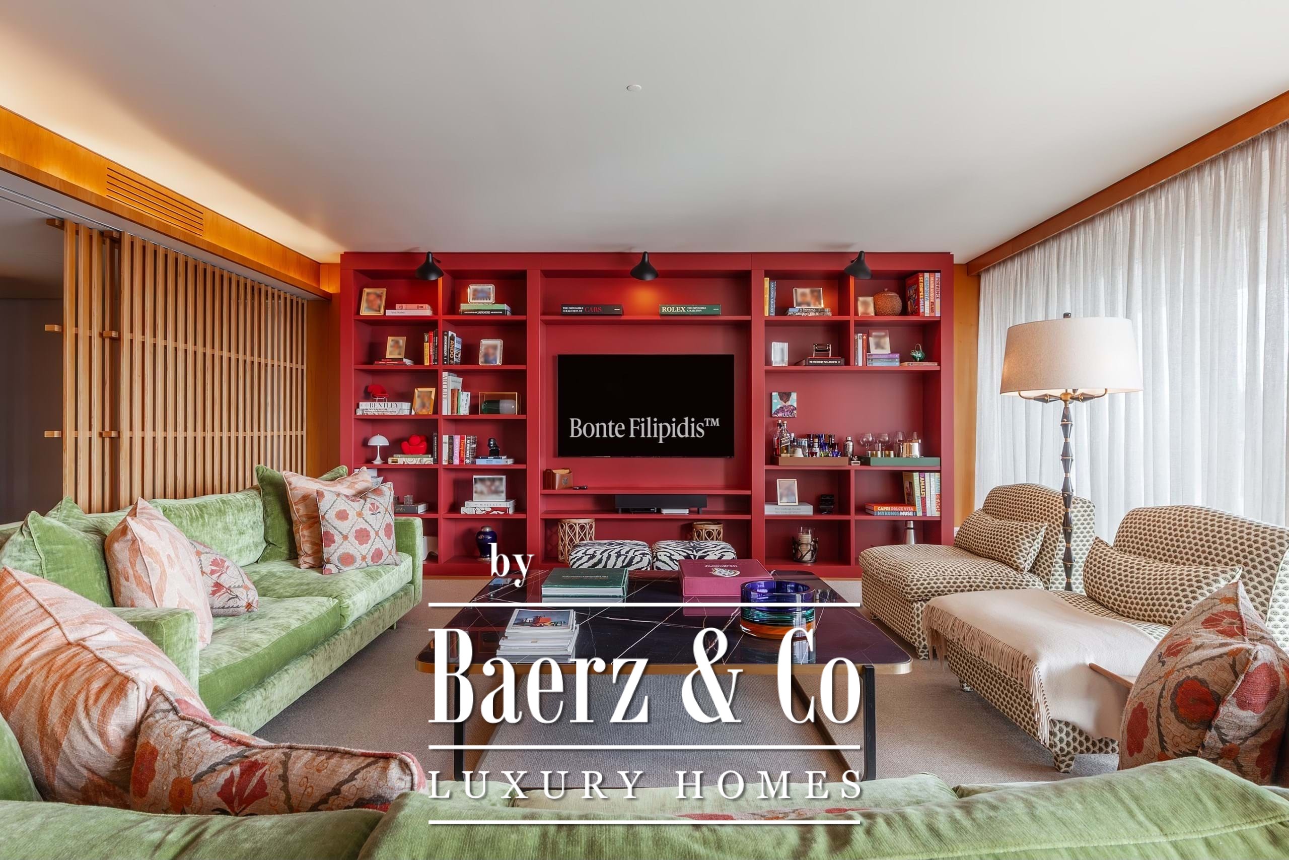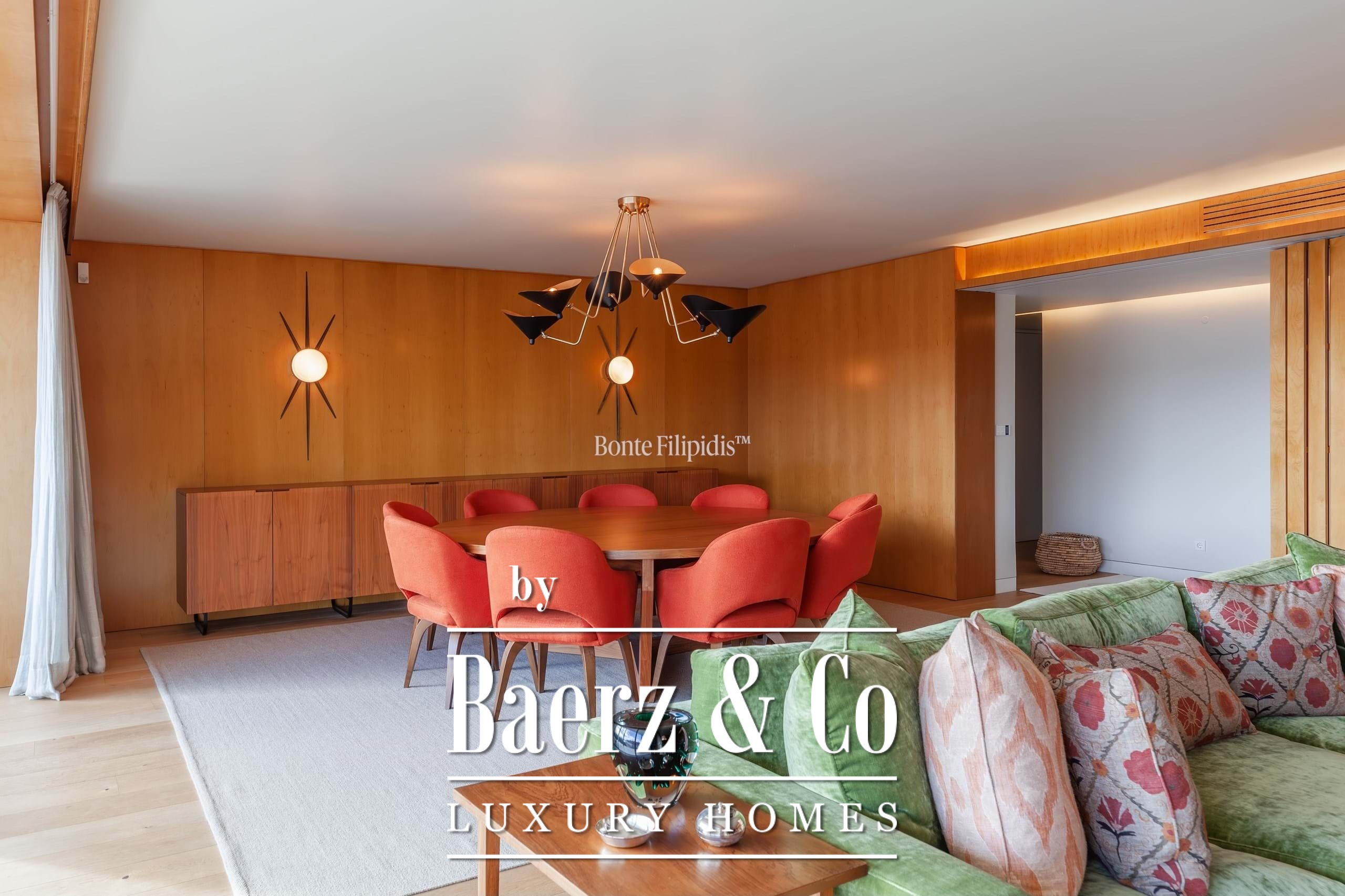 The apartment’s open-plan living and dining area extends directly to the terrace, forming the core of its social rhythm. The contemporary kitchen is fully equipped, with a dedicated laundry area and ample storage, blending utility with understated style. Two of the four bedrooms are suites, with the master featuring a walk-in closet, abundant natural light, and direct terrace access. The private zone balances quiet retreat and generous proportions, while considered wood panelling and curated furnishings shape an atmosphere of warmth and discretion.