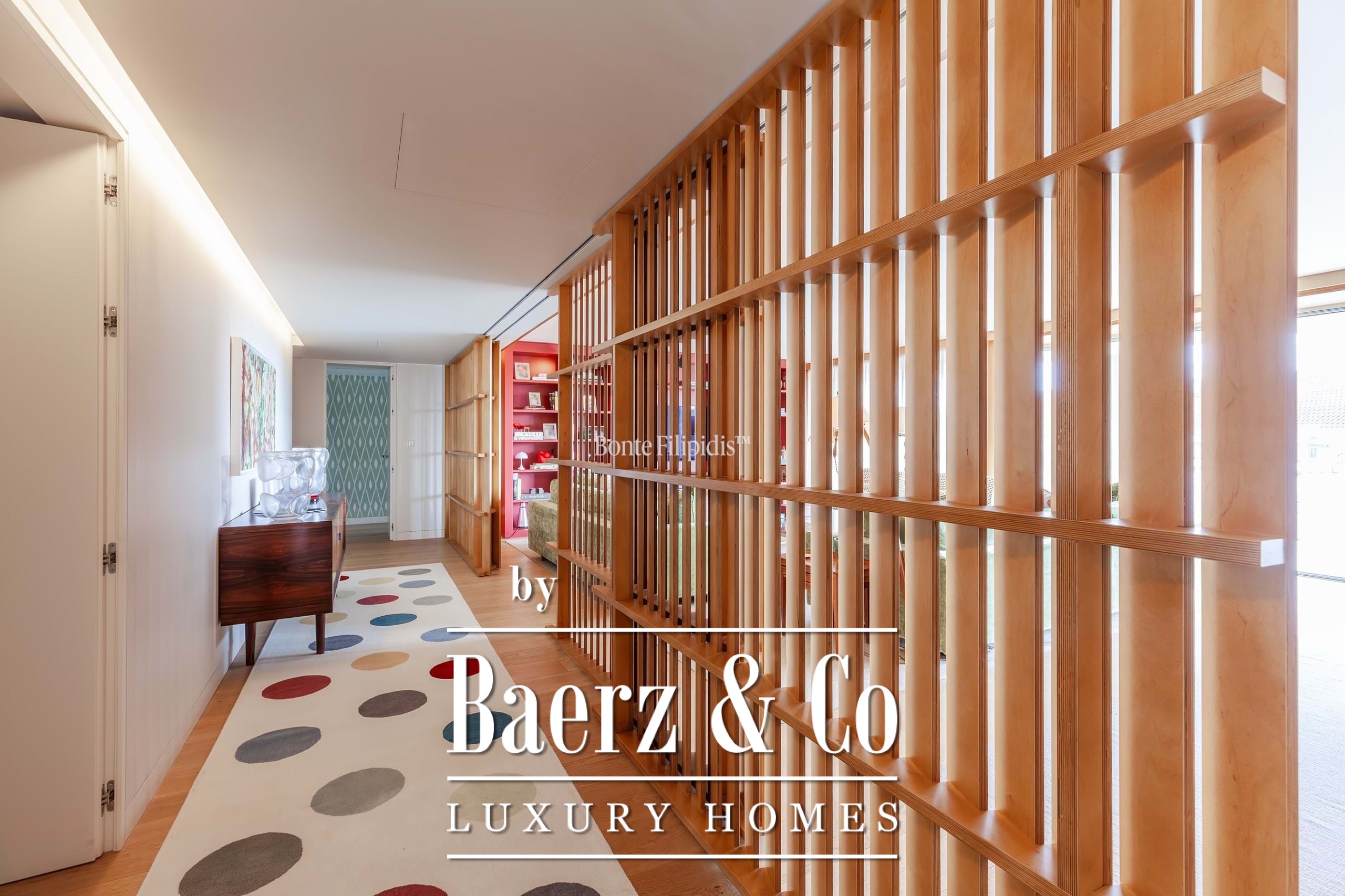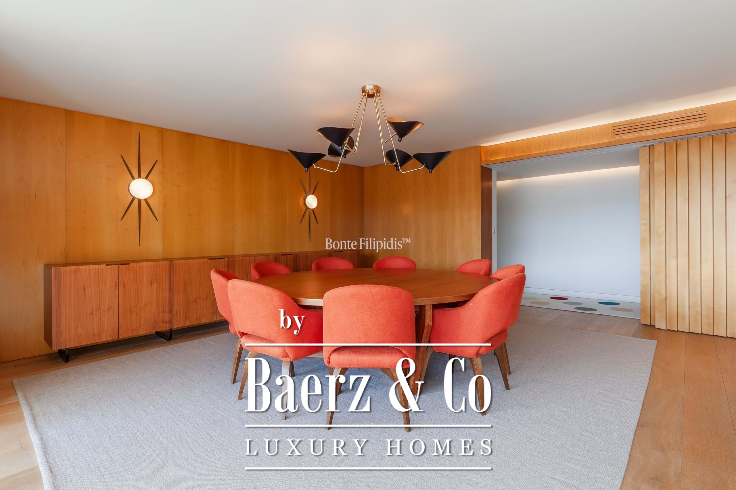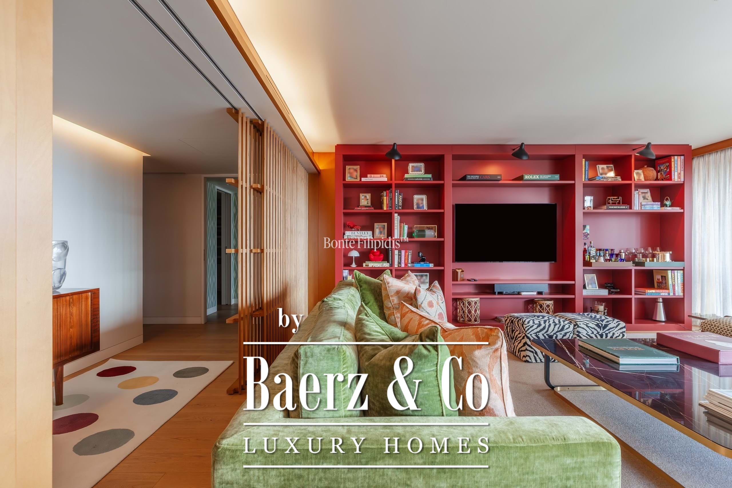 The apartment’s open-plan living and dining area extends directly to the terrace, forming the core of its social rhythm. The contemporary kitchen is fully equipped, with a dedicated laundry area and ample storage, blending utility with understated style. Two of the four bedrooms are suites, with the master featuring a walk-in closet, abundant natural light, and direct terrace access. The private zone balances quiet retreat and generous proportions, while considered wood panelling and curated furnishings shape an atmosphere of warmth and discretion.
