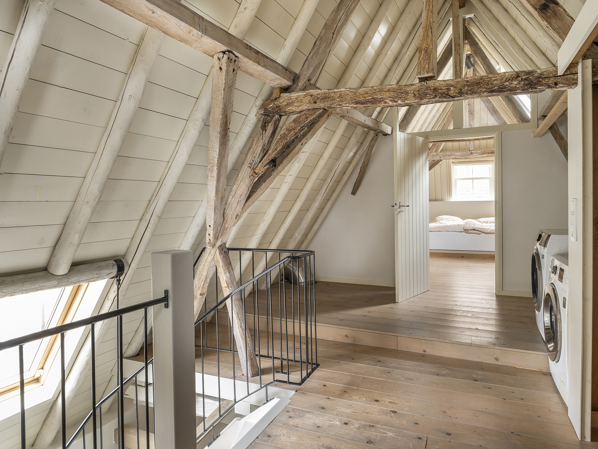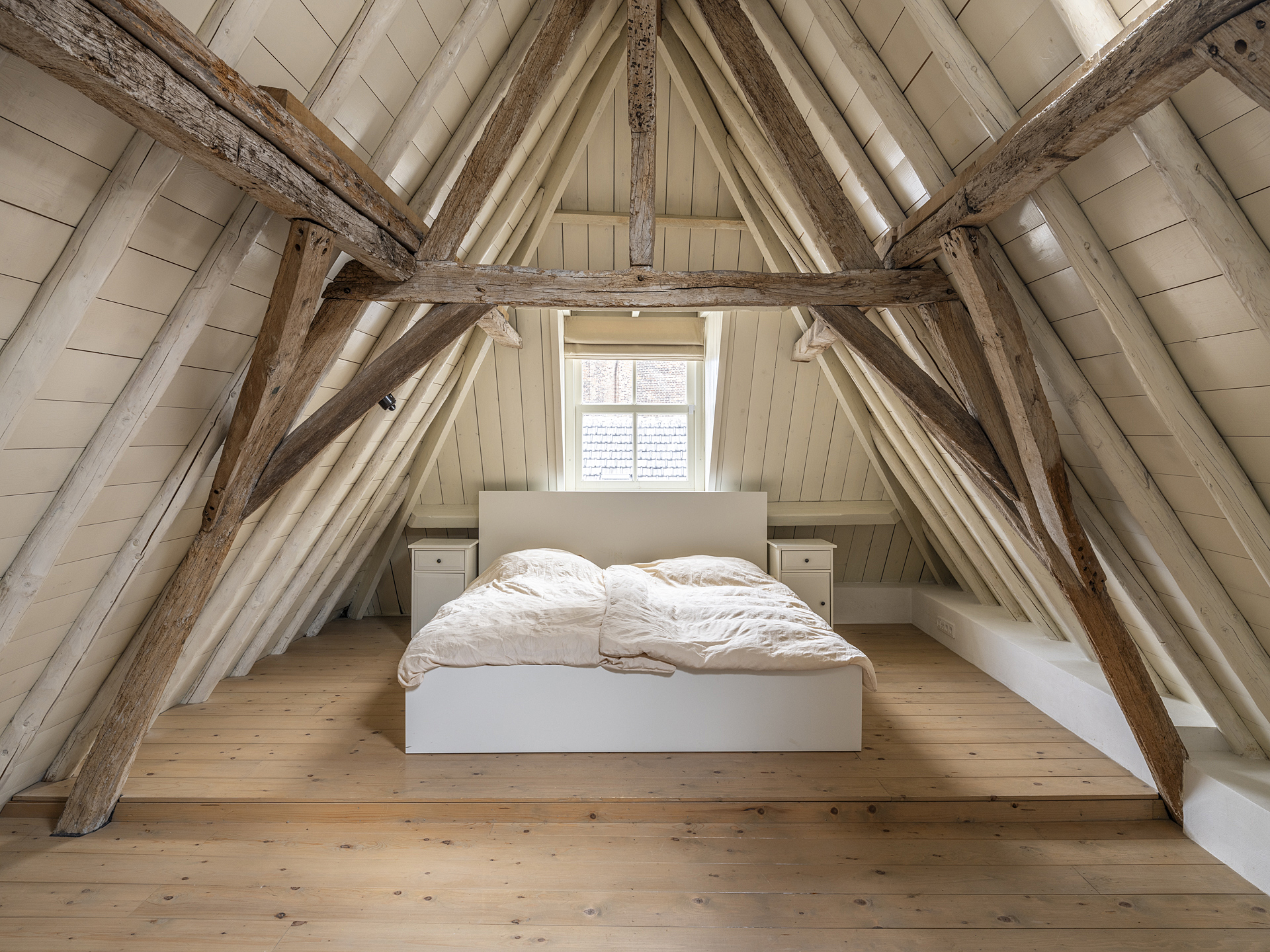 Arranged across five bedrooms and two bathrooms, the residence holds a balance of generosity and privacy. Original beams and trusses lend rhythm to the upper floors, while modern amenities such as air conditioning, a heat recovery ventilation system, and a Homey smart system underscore its move-in readiness. The rear house, once designed for soldiers, now enriches the home’s versatility, ideal for multi-generational living or work-from-home needs.
