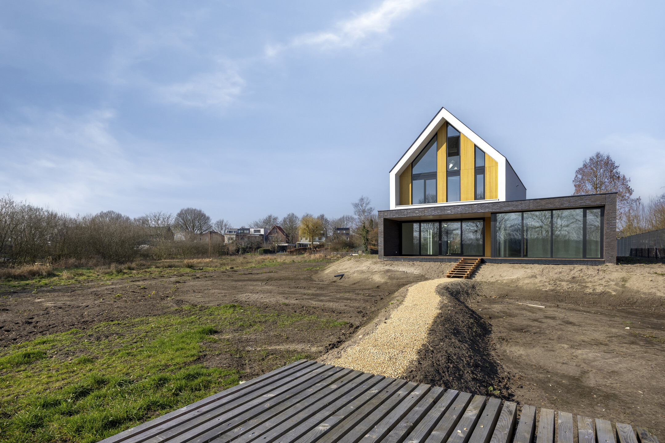 The private greenery transitions into the communal flood garden, which extends to the maintenance path along the Nieuwe Leij. This flower-rich meadow forms a beautiful transition to the nature of the Beekdal and the Gorp en Roovert estate. A (wooden) boardwalk leads you to your private ‘flood raft’: a floating wooden terrace above the flood garden. After an adventurous ‘walk’ or a hard day’s work, you will find your own quiet spot here by the beautiful Beekdal.