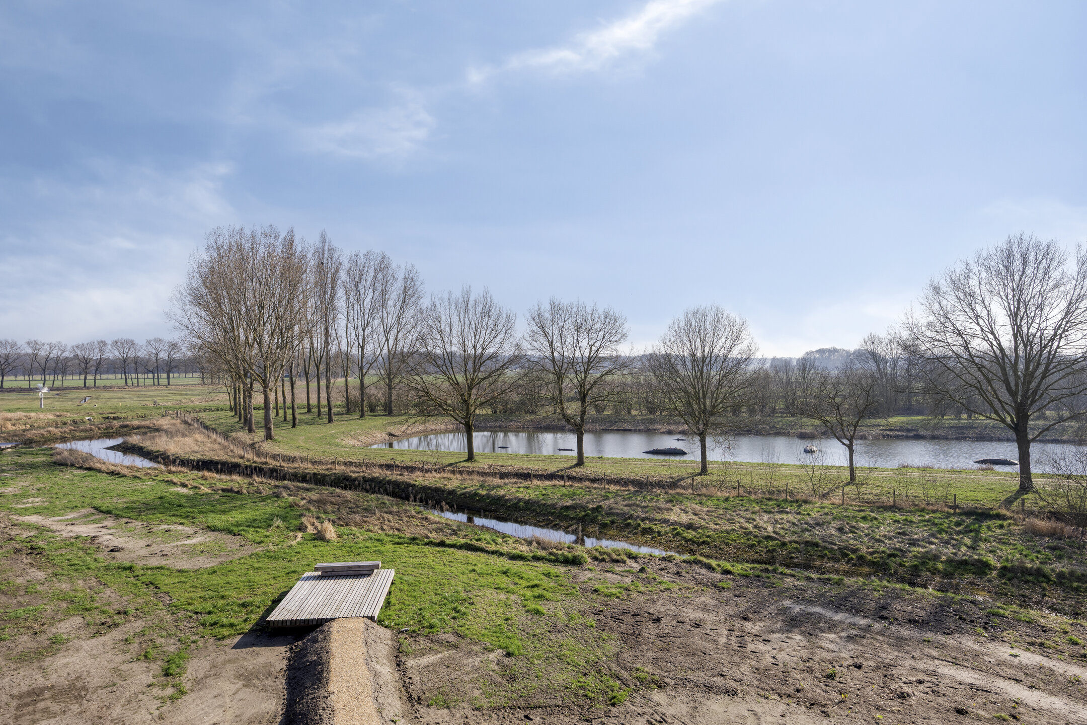 The flood garden on the edge of Land van Anna is a communal piece of hay meadow that belongs exclusively to the ten detached villas and is occasionally flooded by excess (rain)water in the Nieuwe Leij. This creates the botanical richness of a dry to wet flower-rich meadow.