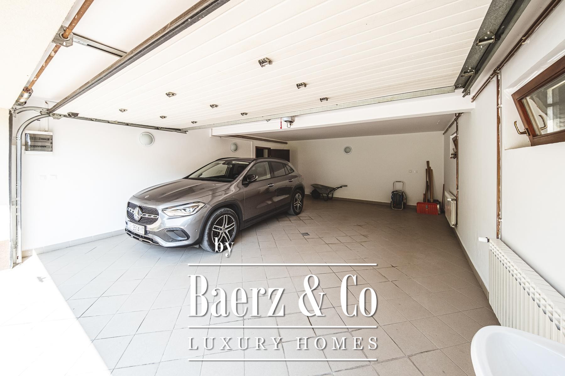 The property unfolds across three levels. The basement grants internal double garage access, generous storage, and an additional flexible room. On the ground floor, an open plan living and dining space flows naturally to a terrace and the landscaped garden, merging indoor comfort with the calm of outdoor living. The kitchen comes fully equipped, joined by a study or fourth bedroom, and a discreet guest bathroom. The first floor reveals two further bedrooms, a refined bathroom, and a master suite with its own bathroom and dressing area.