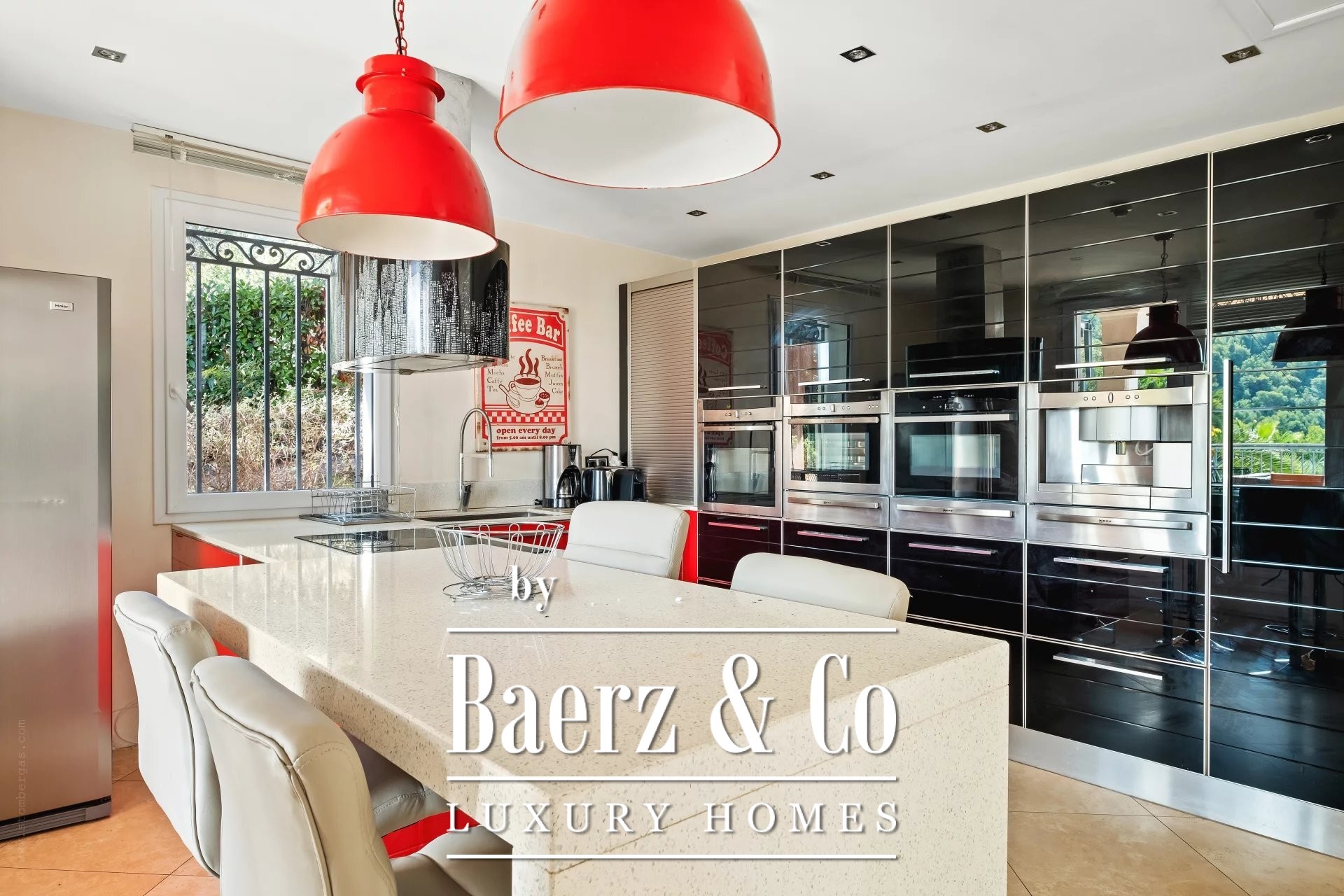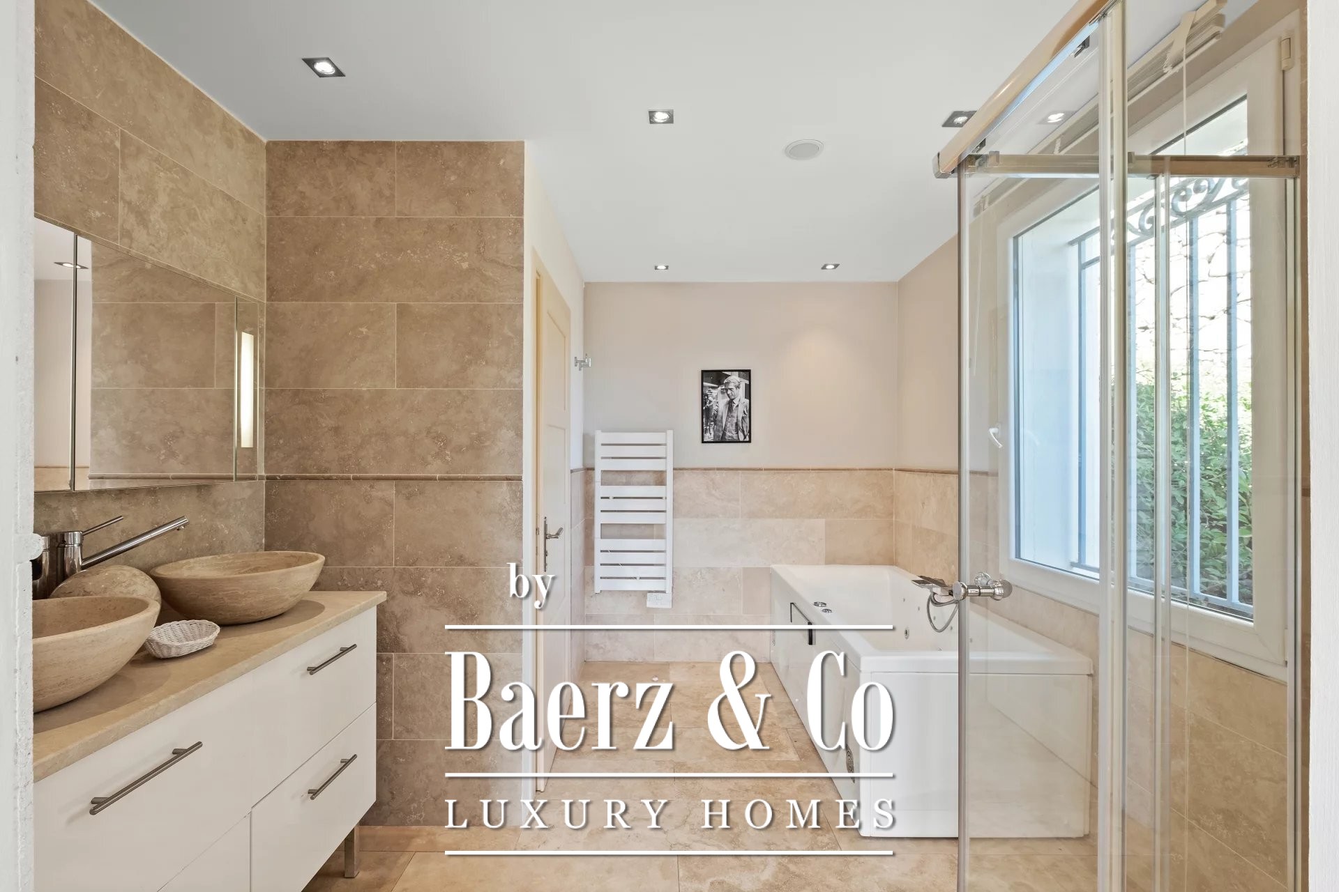 An independent apartment with two large bedrooms, bathrooms, a kitchen and living room extends possibilities for privacy or guests. The landscaped 3000 m² grounds include a spacious pool, a dedicated pool house and broad terraces that open toward the horizon. Amenities such as air-conditioning, fireplace, lift, video security, electric gate, and covered garage imbue the property with discretion and comfort. This villa offers a refined pace of life, set against panoramic Mediterranean vistas.